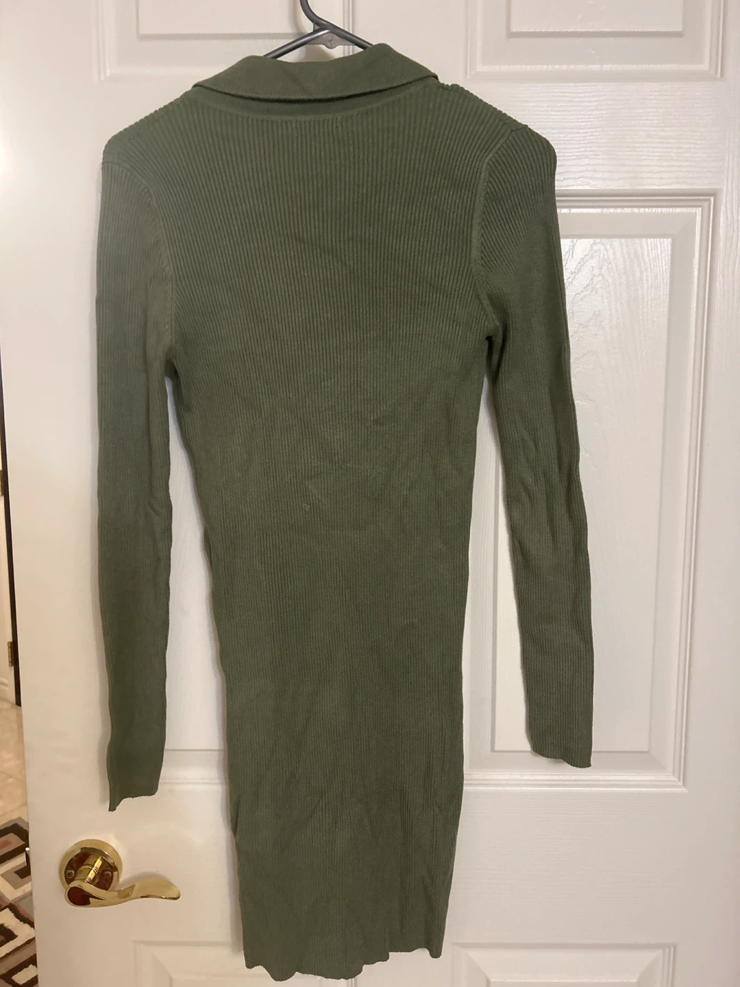 Selling a cute olive green mini dress from Stradivarius. It's a ribbed knit material with a collared neckline and button-up detail. Size is small and it’s brand new without a tag! Haven’t worn it since I don’t like the tight fitting. Great for fall