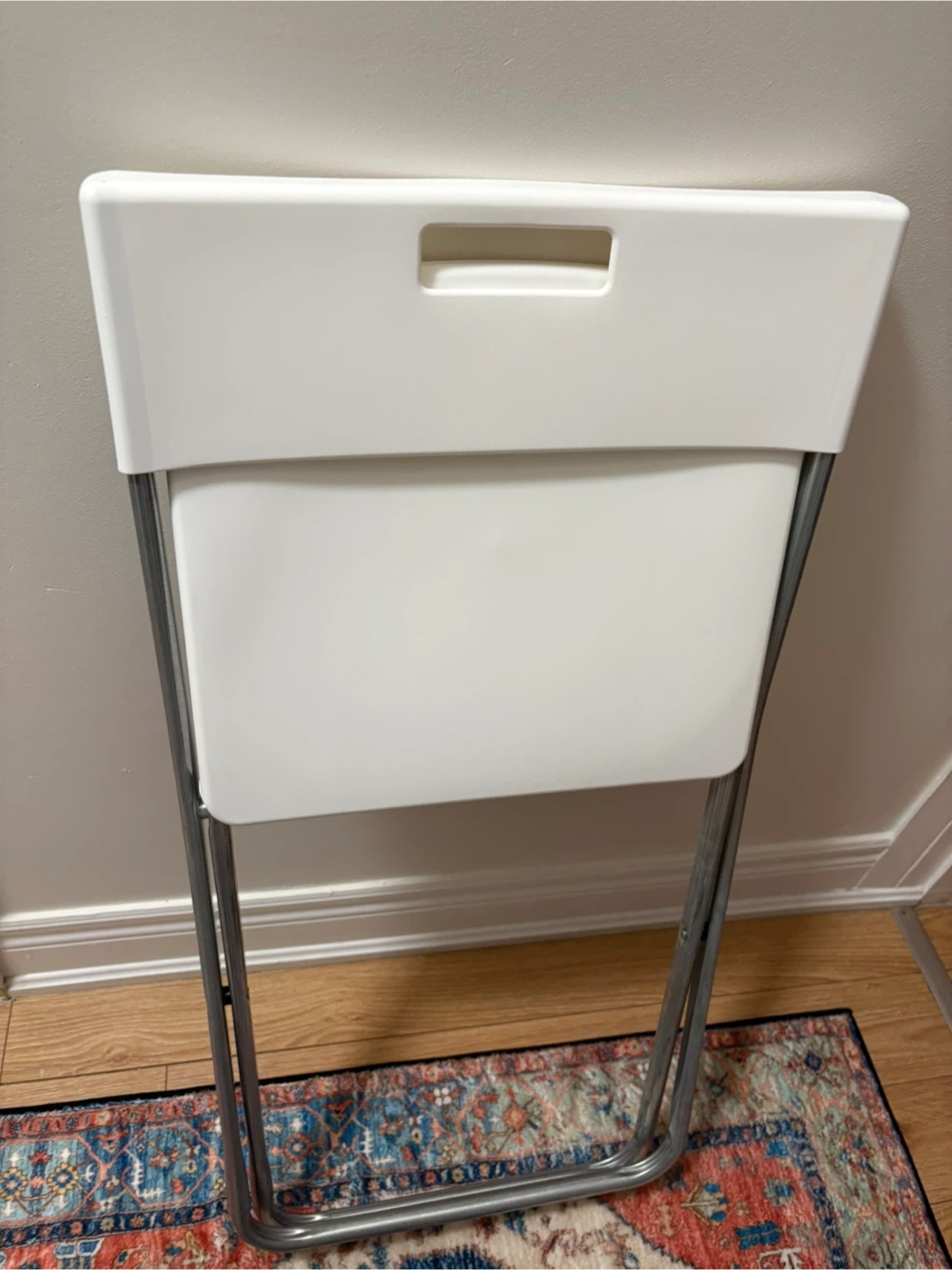 Selling a white IKEA Gunde folding chair! It's super handy when you need an extra seat but don't want it taking up space all the time. Folds up easily for storage. Used once.