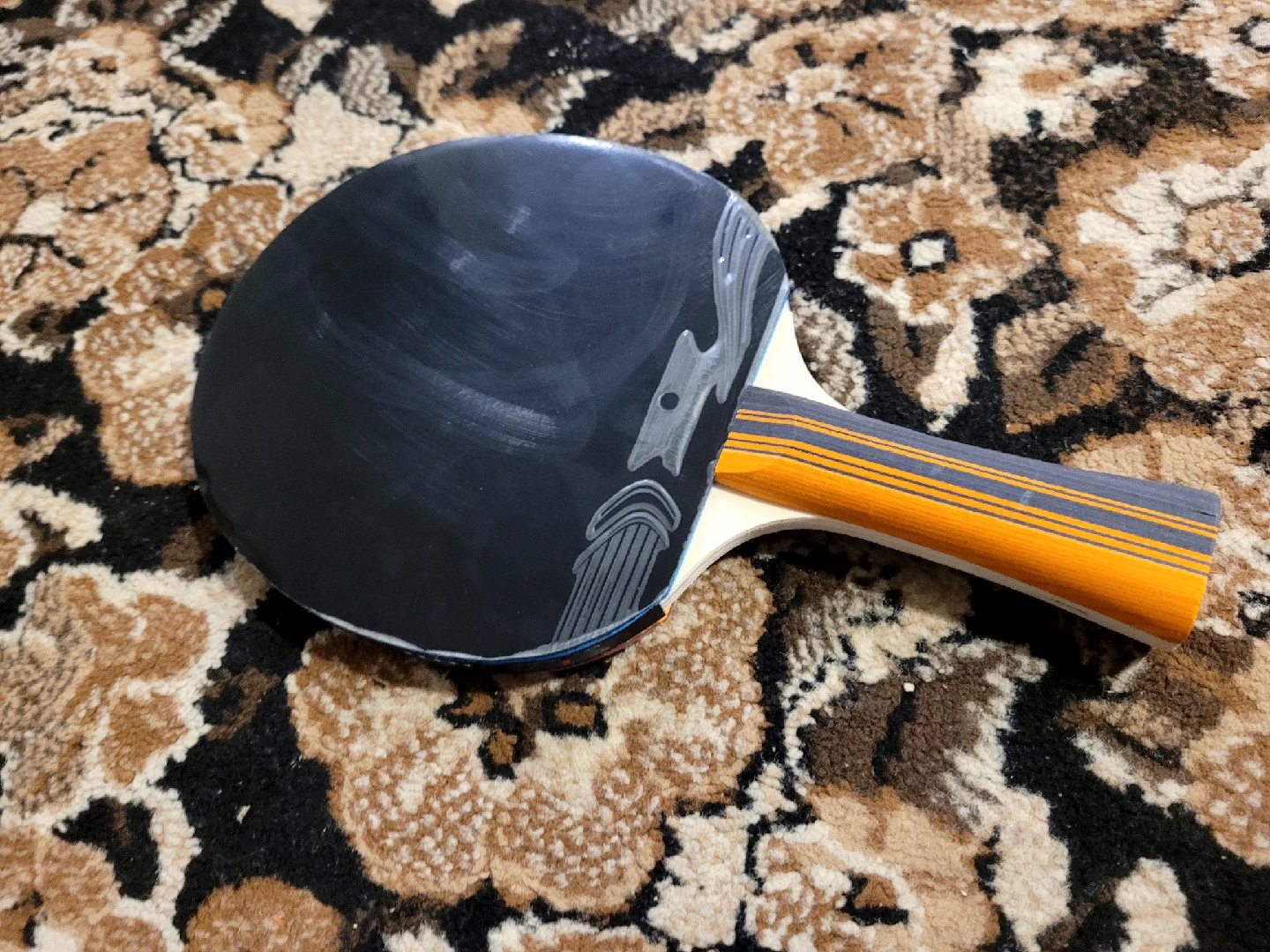 Selling a table tennis racket from Nibiru Sport. It has a black and red rubber surface. The handle is orange with black stripes. Great for recreational play!
