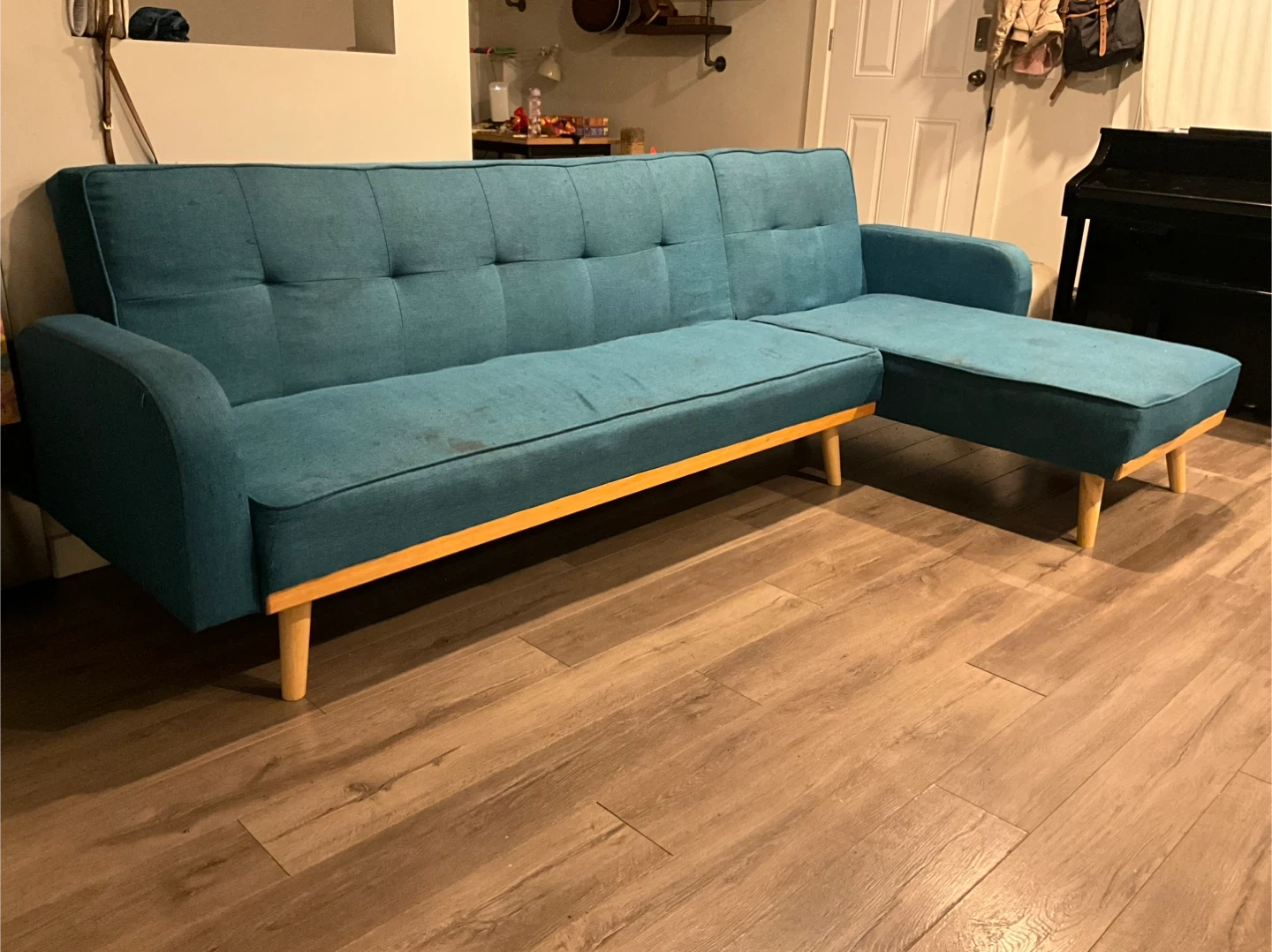 Looking to give this teal futon couch with a chaise lounge to a new home. It's a great piece for a living room or den. There are some signs of use from the kids (could use a bit of cleaning) but it's still in good condition and super comfy for lounging or having guests over or sleepovers.