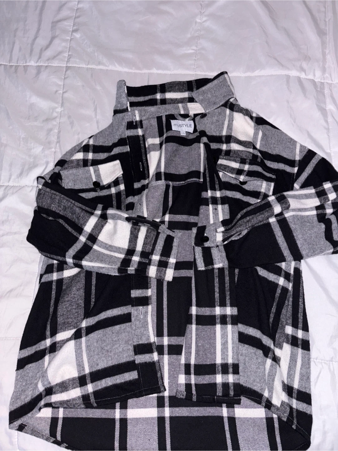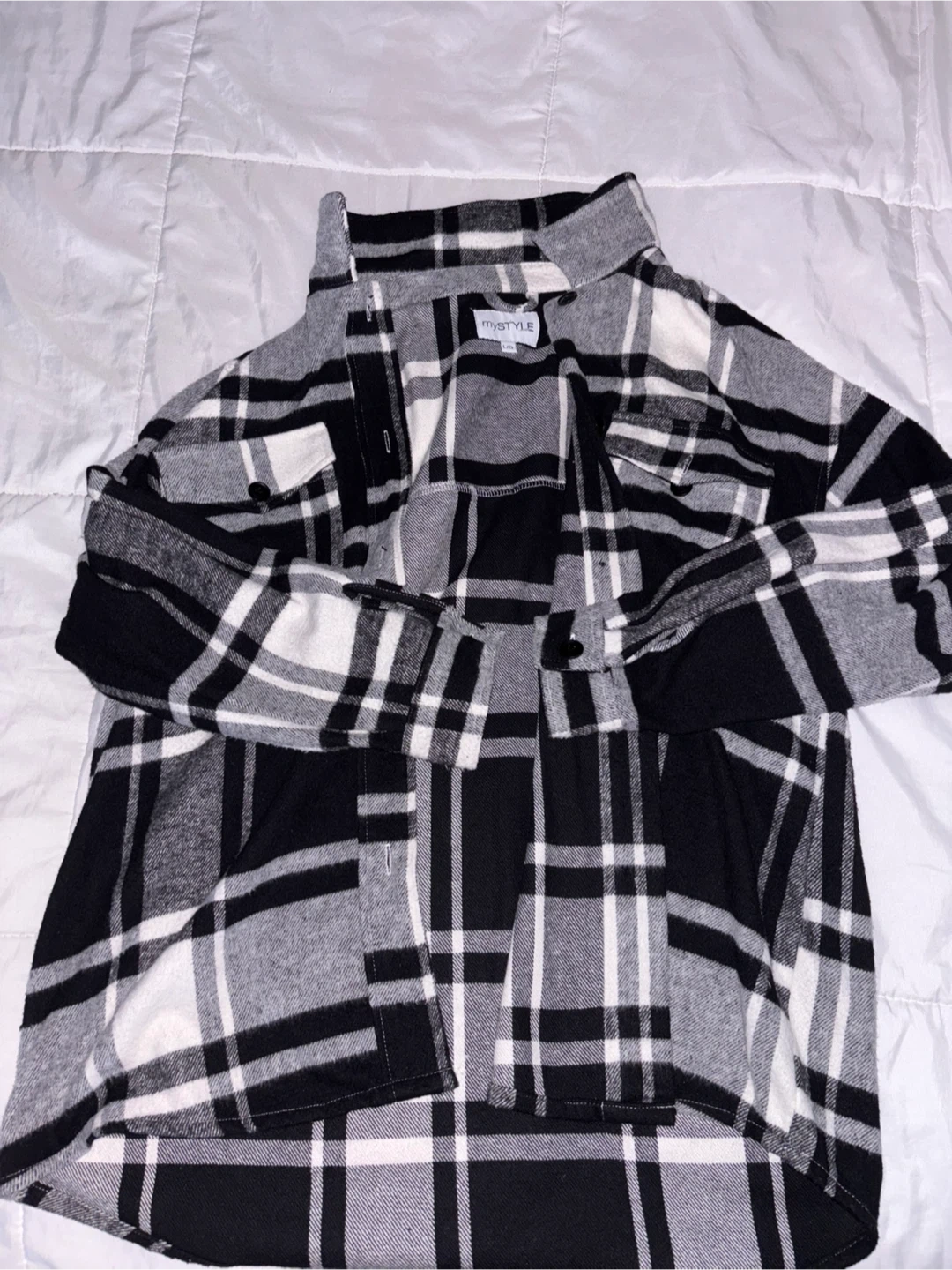 Here's a comfy black and white plaid flannel from My Style! It's in great condition and perfect for layering or wearing on its own. The material is soft and cozy, making it ideal for those cooler days. It's a versatile piece that can be dressed up or down! I’ve never worn the sweater.