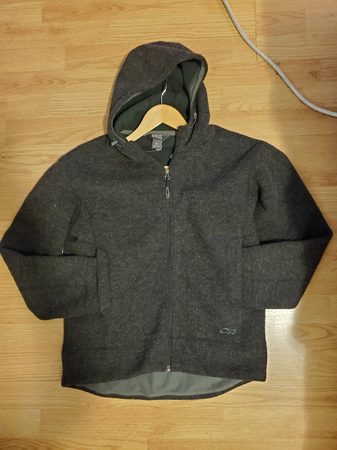Outdoor Research Exit Hoodie 50911 in a dark grey colour. Size is small. The material is 63% polyester, 26% wool, and 11% nylon on the face, and 100% polyester on the back.