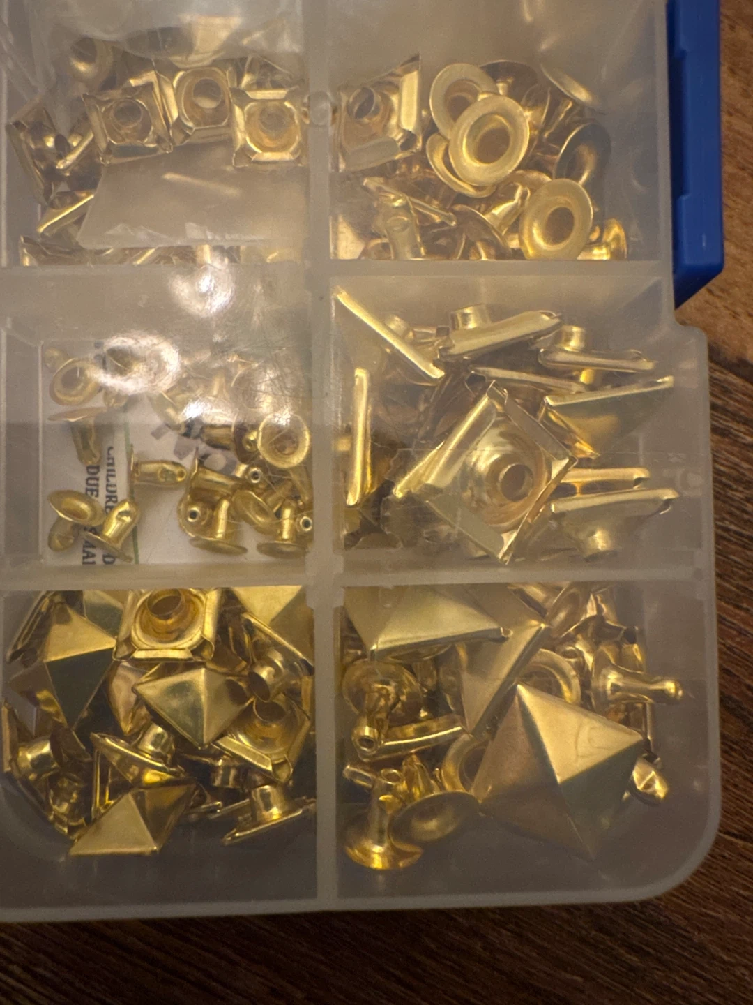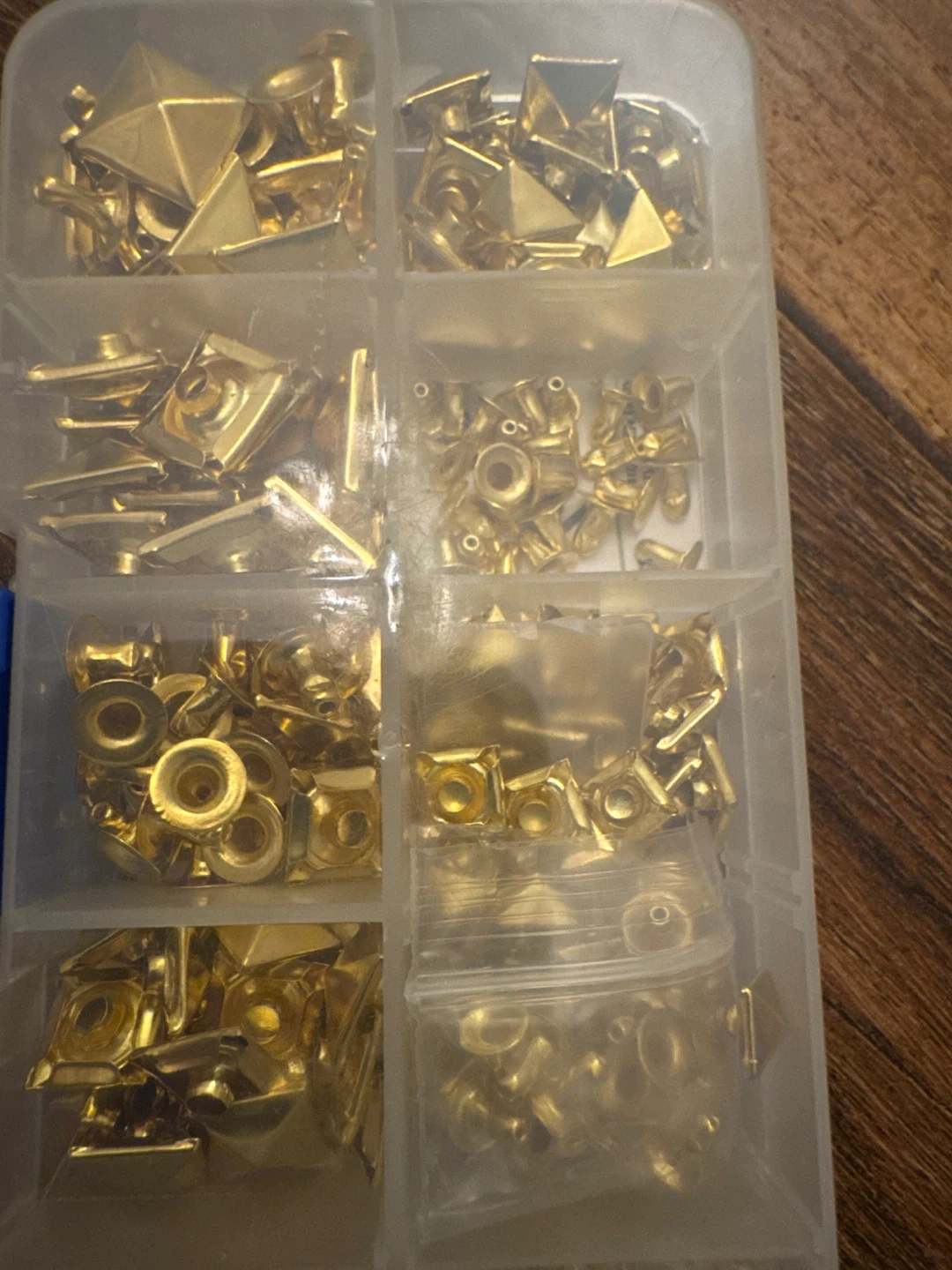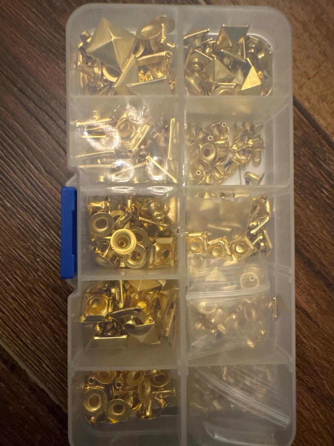 Assorted gold studs and rivets for your crafting needs! This set comes in a clear plastic organizer with multiple compartments. Perfect for adding some flair to clothing, bags, or other DIY projects