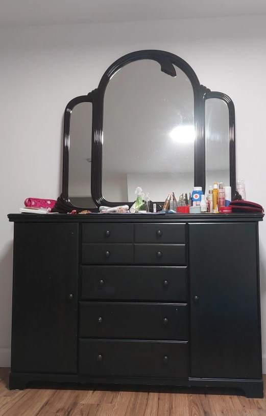 Selling a dresser with a large mirror. It has two cabinets and four drawers. There are some signs of wear and tear, but it's still in good condition and very functional.