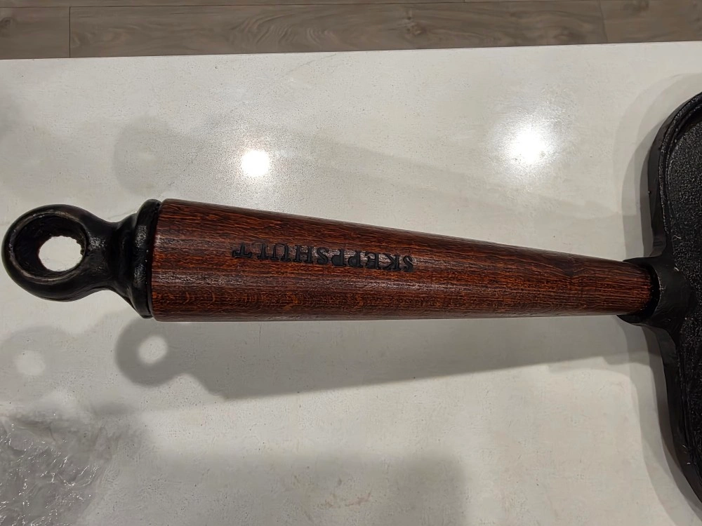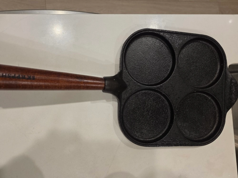 Selling a Skeppshult cast iron pancake pan. It makes four perfect pancakes at a time. The handle is made of wood.