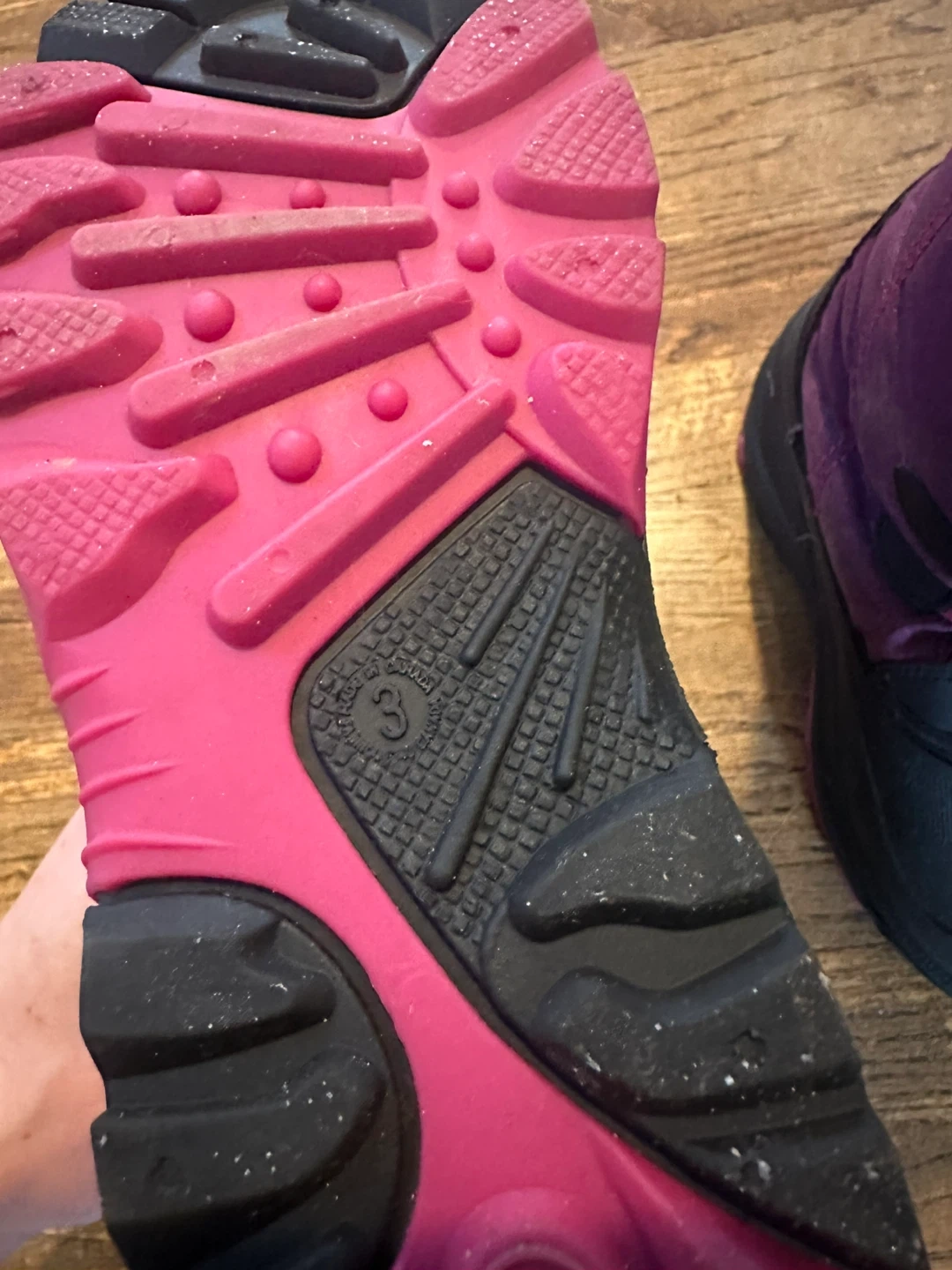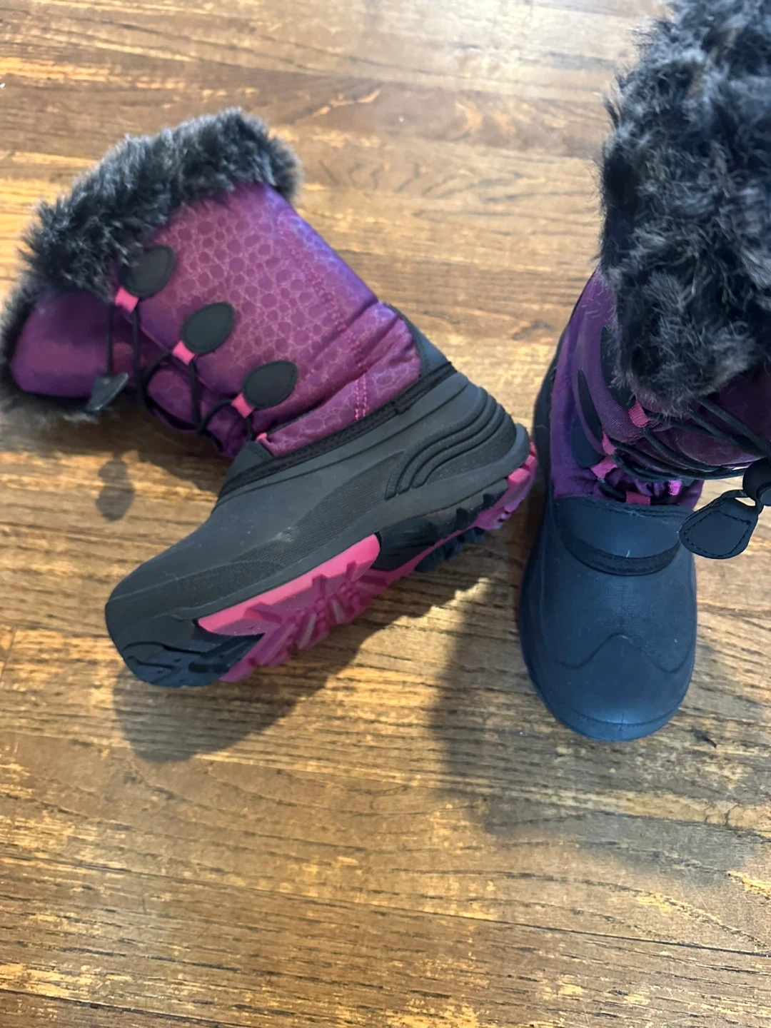These girl's winter snow boots are perfect for keeping little feet warm and dry! They are a size 3 and feature a fun purple and black design with faux fur trim. The soles have good traction for snowy and icy conditions