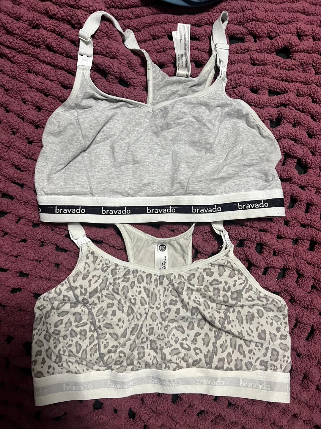 Two Bravado pumping bras in great condition! One is a solid grey and the other has a cute leopard print. Both are size medium and have the Bravado logo on the band.