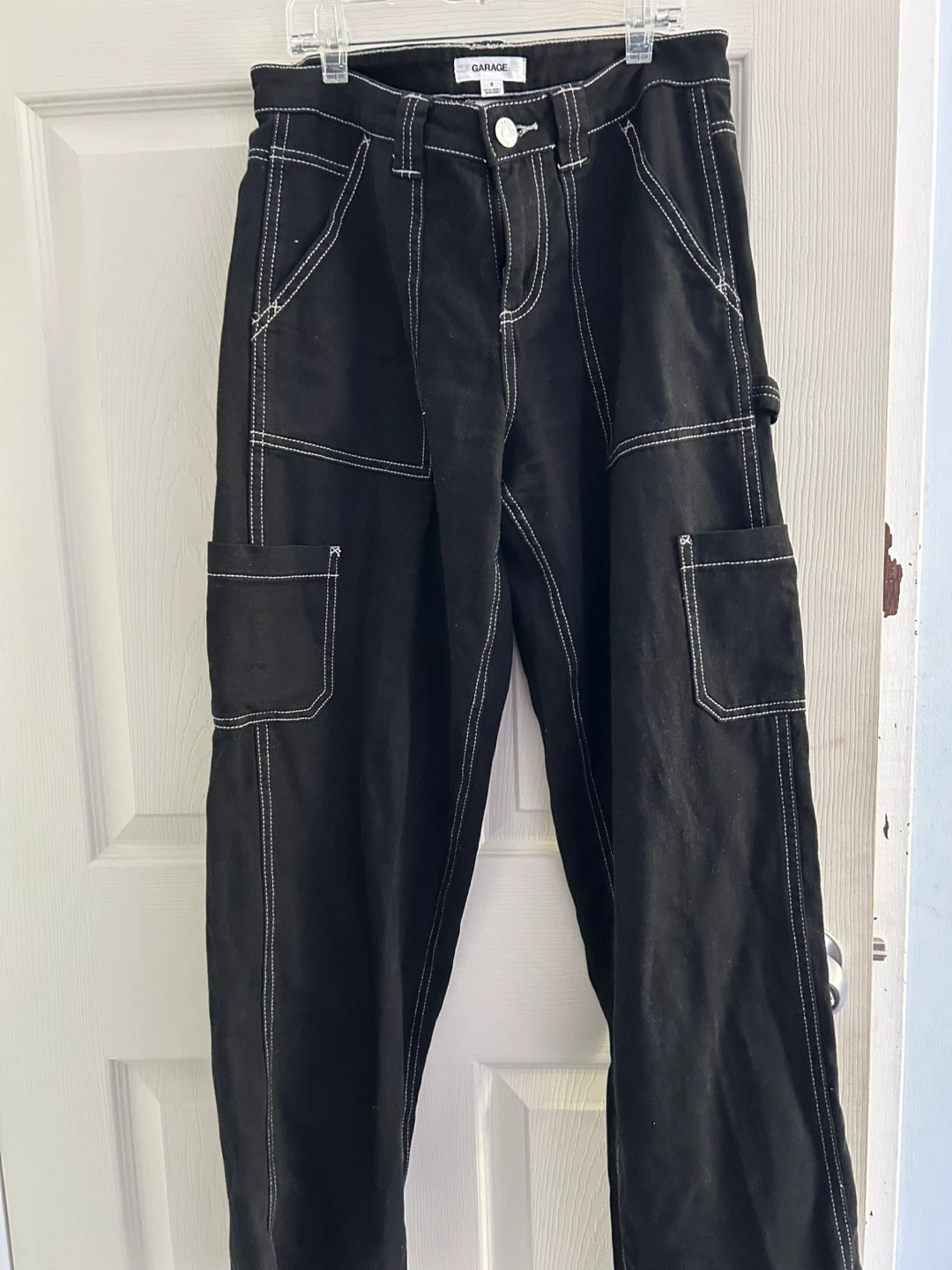 10Selling a pair of black carpenter pants from Garage. They are in great condition and feature a stylish design with contrasting white stitching. Perfect for a casual or trendy look!