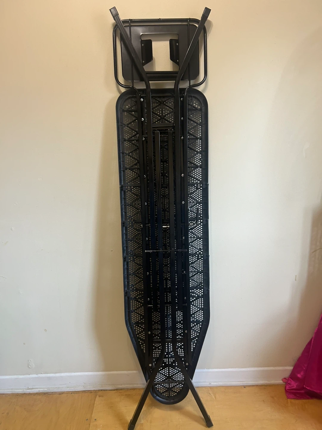 Selling a black metal (legs)ironing board in good condition. It features a perforated surface and a metal frame. It is pretty sturdy and durable! 53 inches.