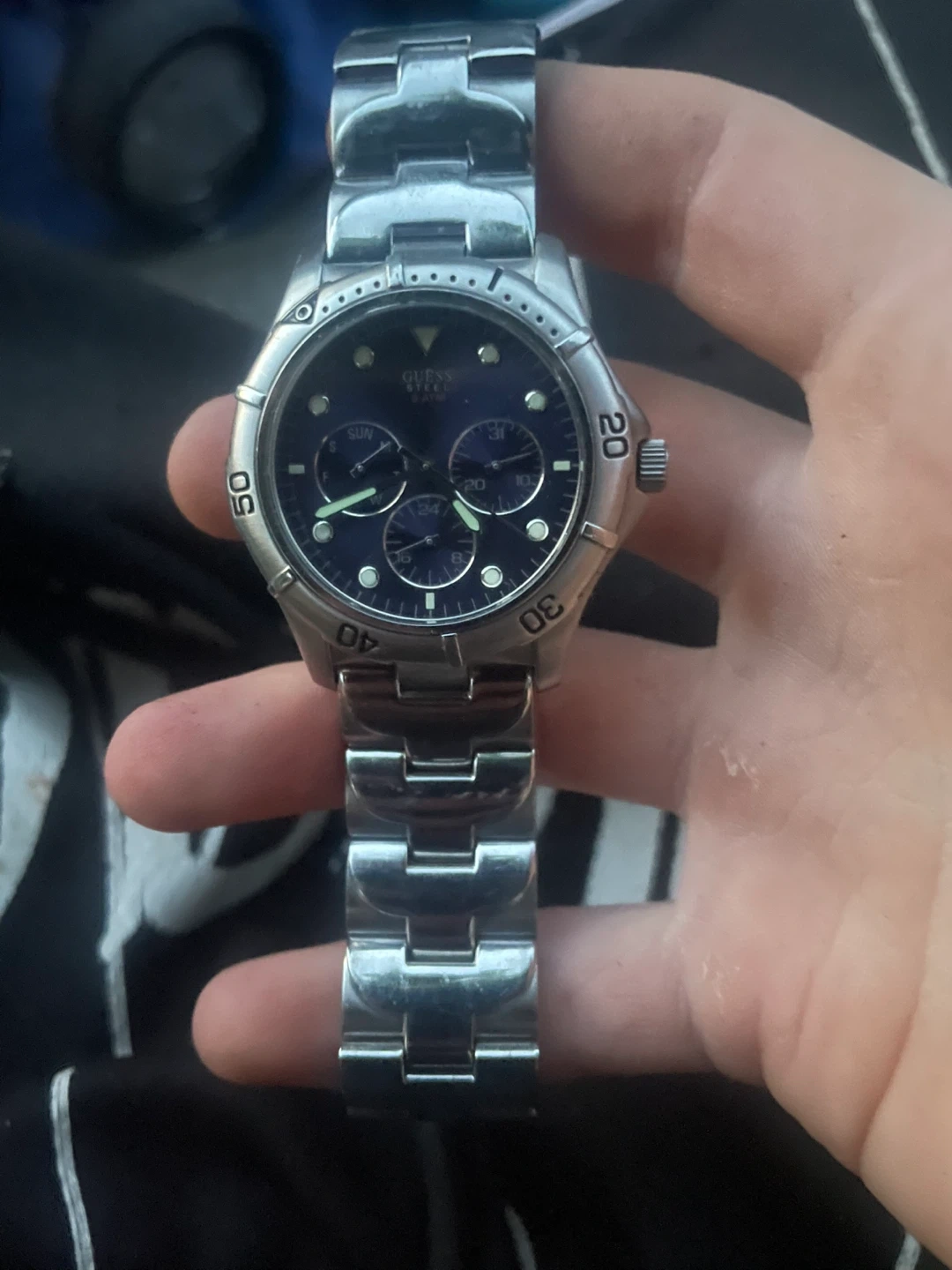 Selling a Guess watch in silver-tone stainless steel. It's in good condition and ready for a new home! Features a classic design that goes with everything