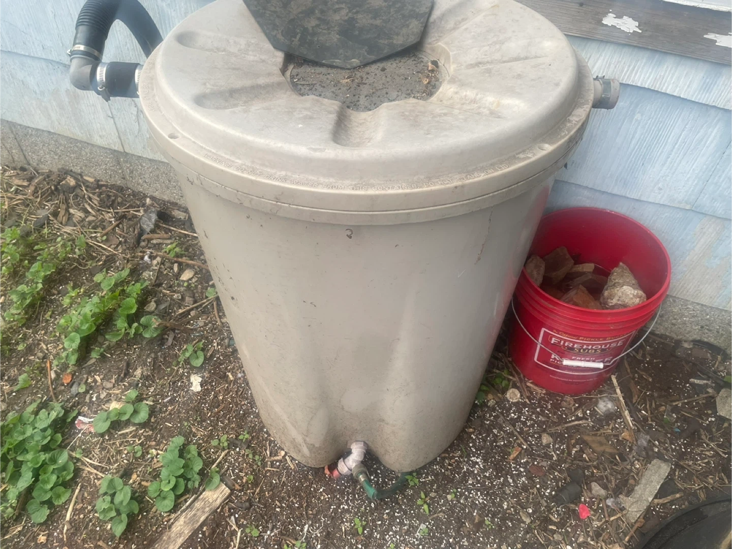 Selling a used rain barrel. It has some signs of wear and could use a cleaning, but it's still functional for collecting rainwater for your garden or other outdoor needs