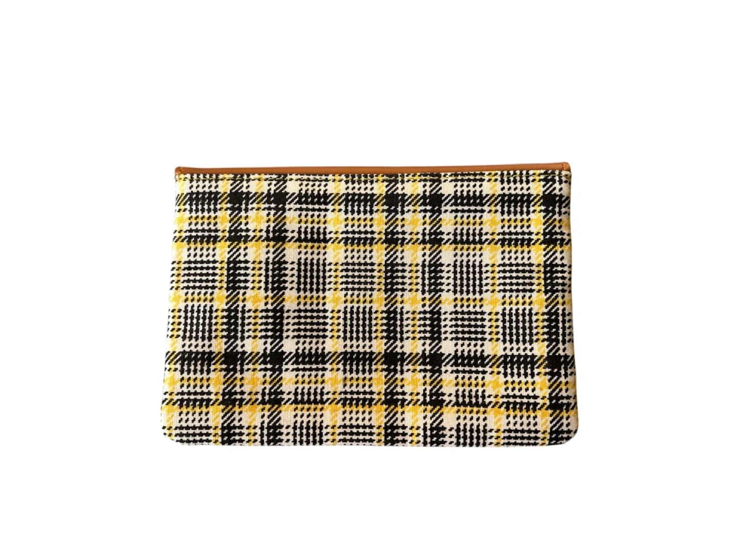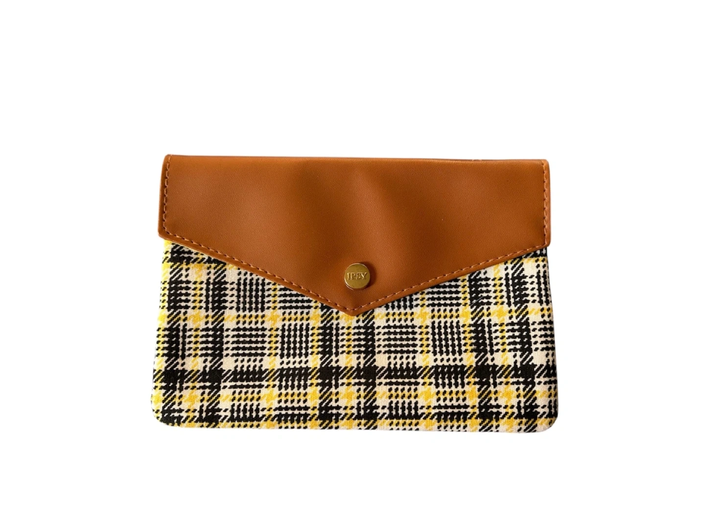 This Ipsy clutch has a stylish plaid pattern in yellow, black, and white. It features a brown faux leather trim and a magnetic snap closure. Perfect for carrying your essentials in style!