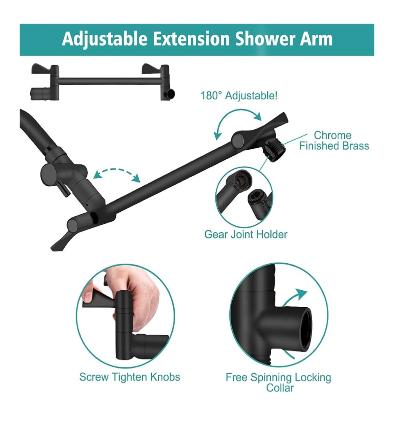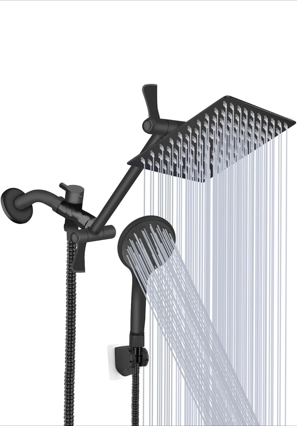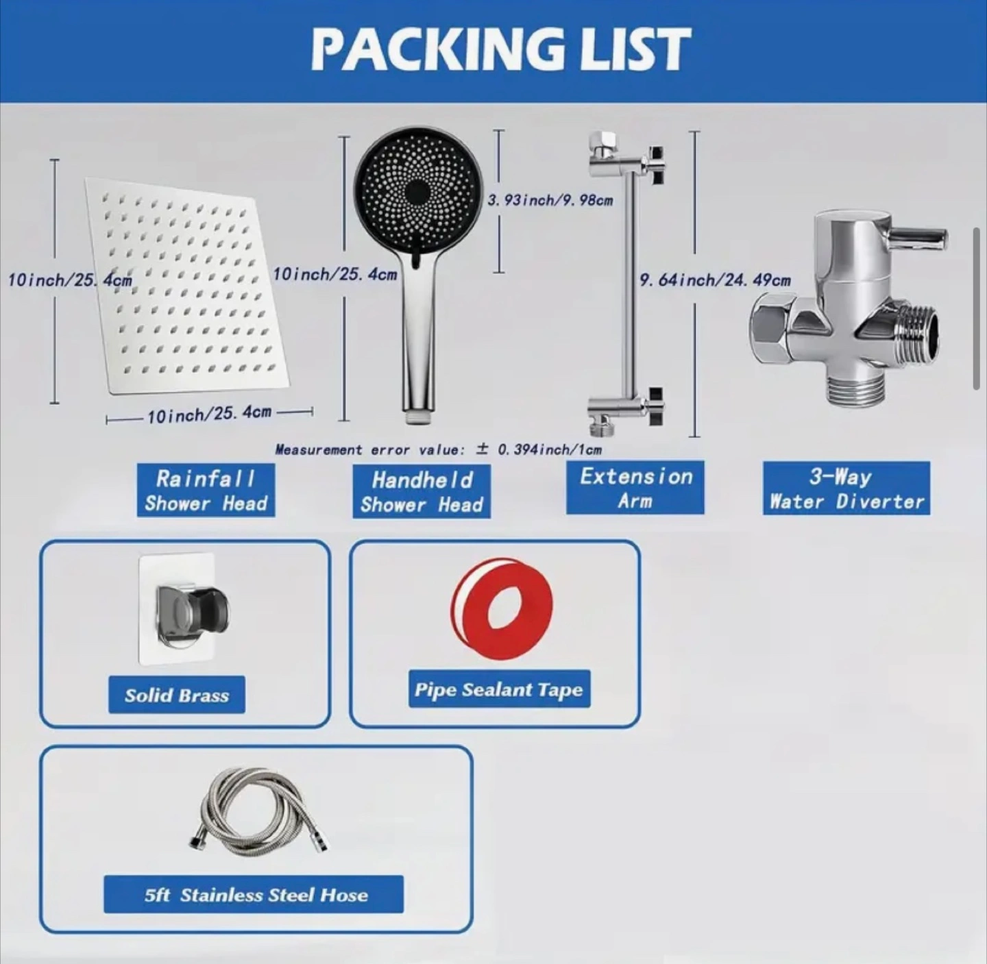 10 inch shower head and a 3-way water diverter. The set also features a 5ft stainless steel hose and pipe sealant tape.