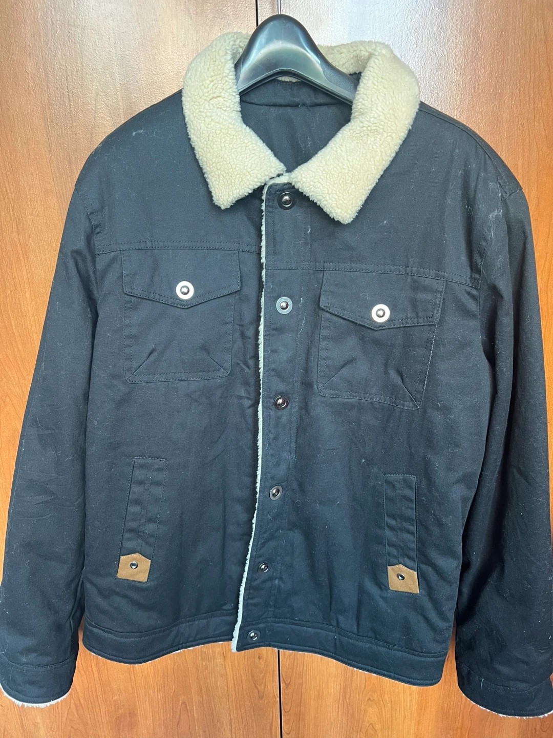 Classic black jacket with a cozy sherpa collar. It's in great shape and ready for a new home. Perfect for those chilly days when you need a bit of extra warmth