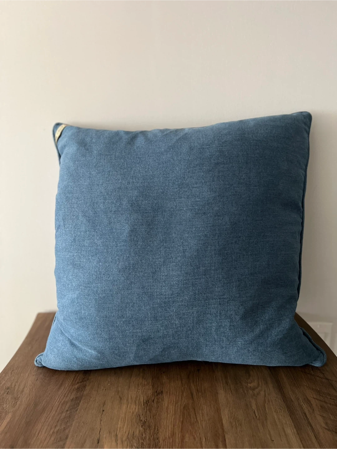 A lovely blue throw pillow, perfect for adding a touch of colour to your living room or bedroom! It's in great condition and ready to find a new home. It would look great on a couch or bed!