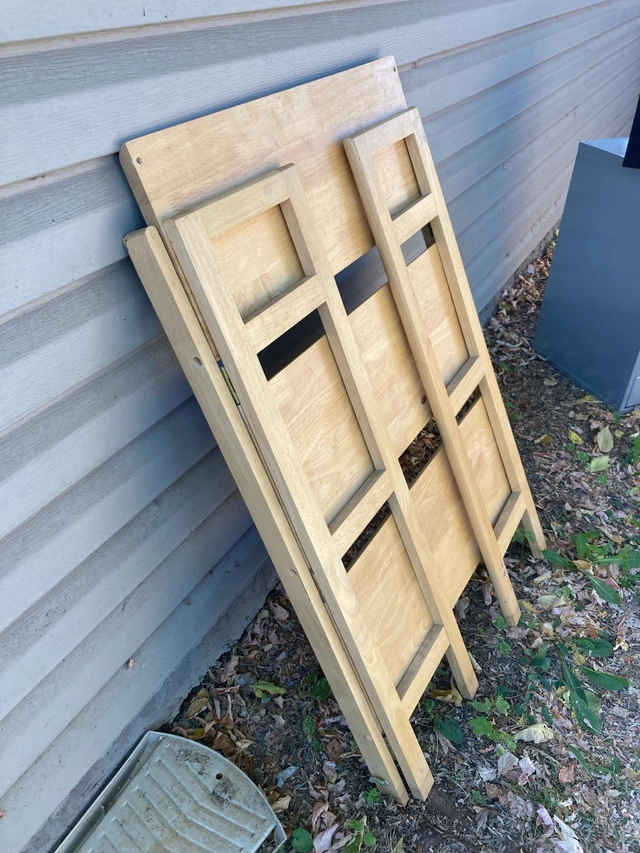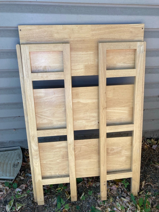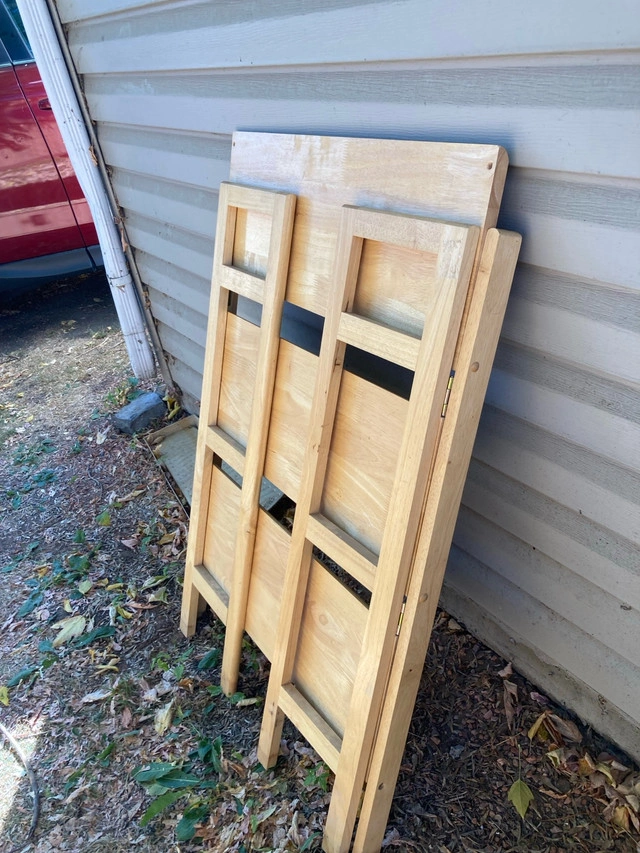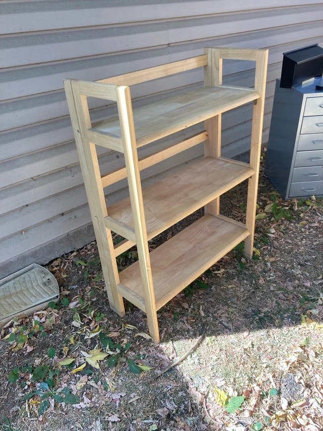 This foldable shelf is perfect for adding extra storage space without taking up too much room! In used condition, it still has a lot of life left and is ready to hold your books, plants, or anything else you need to display. It's super easy to fold up and store away when not in use, making it ideal for small spaces. 20 firm. Solid wood. If the ad is still up, the shelf is still available!