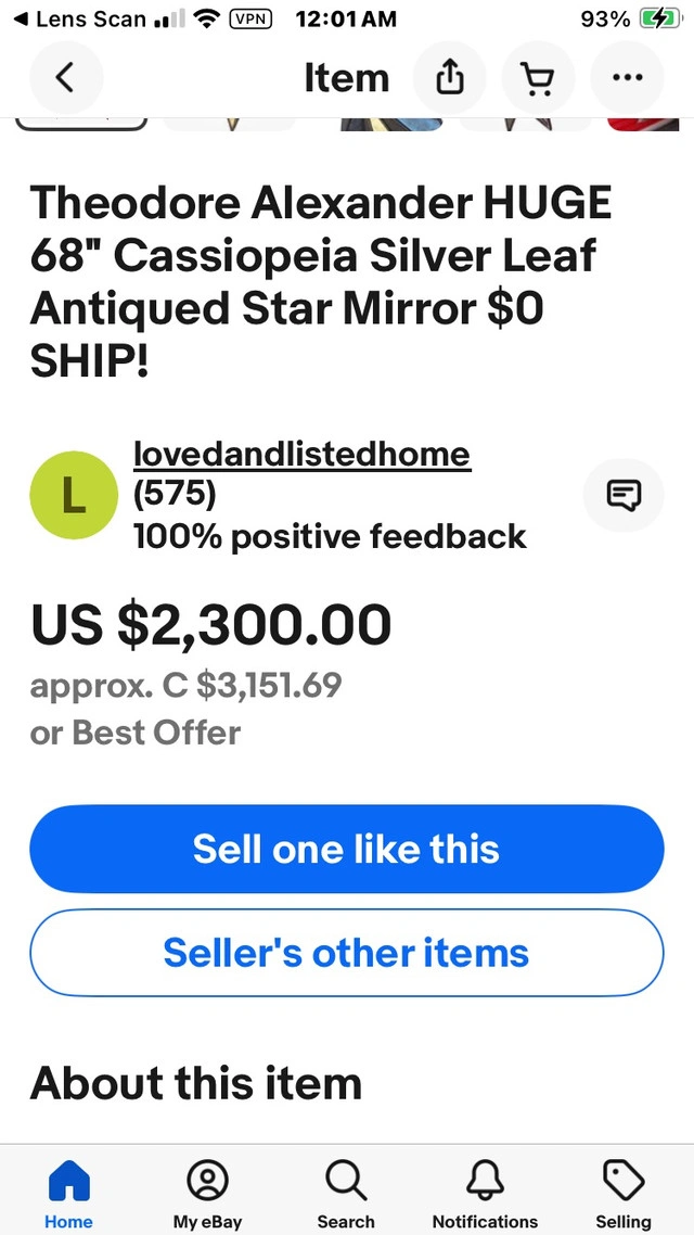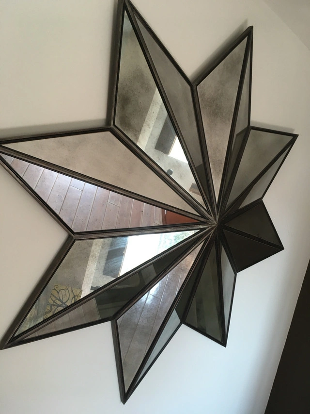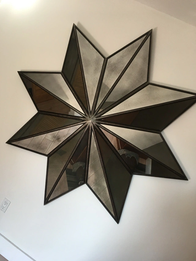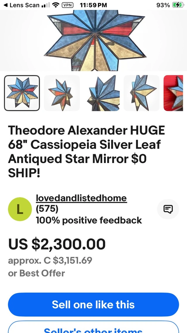 Add a touch of elegance to your home decor with this gorgeous Theodore Alexander Cassiopeia Silver Leaf Star Mirror, measuring 68 inches. It's a stylish and functional piece, perfect for adding depth and dimension to any room. This mirror features a beautiful star-shaped design and is framed with an antique silver leaf finish that gives it a timeless, classic look. Being a used item, it has its own unique story to tell, adding character to any space it graces. It was discontinued in June 2018. Specifications: - Brand: Theodore Alexander - Design: Cassiopeia Star Mirror - Finish: Antique Silver Leaf - Size: 68 inches This star mirror is ready to find its new home! If the ad is up, it's still available. HEAVY!!!! Please bring at least two people (seriously !) with a trolley. Cash only, no holds.