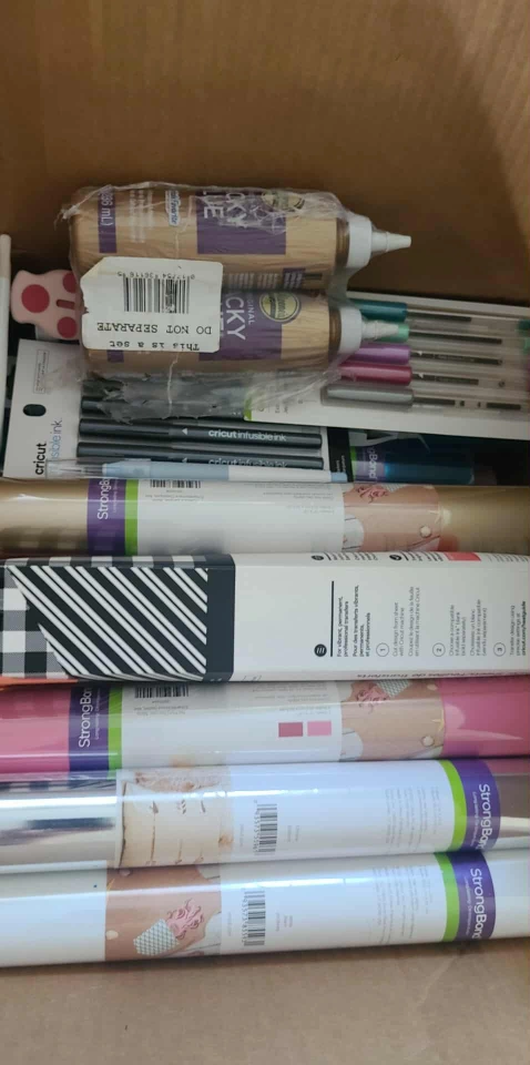 Selling a crafting bundle with various Cricut items! Includes Cricut Infusible Ink pens, StrongBond vinyl rolls in different patterns and colours, and some Lucky Original glue