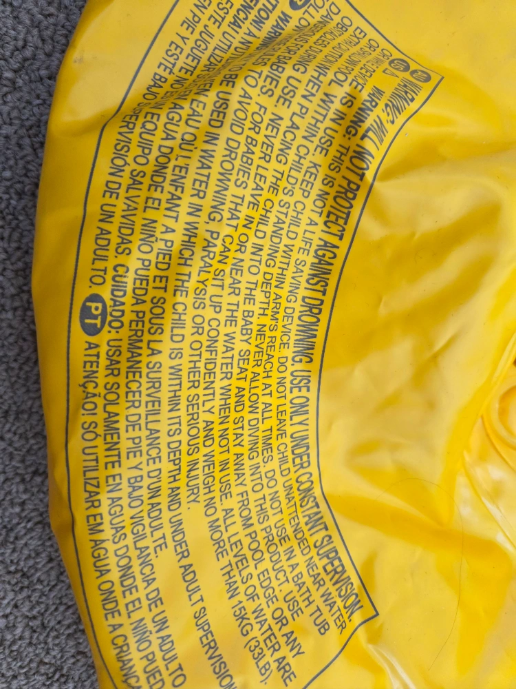 This is an Intex My Baby Float in yellow! It's designed for babies and is perfect for introducing your little one to the water. It's important to always supervise your child while they are using this float