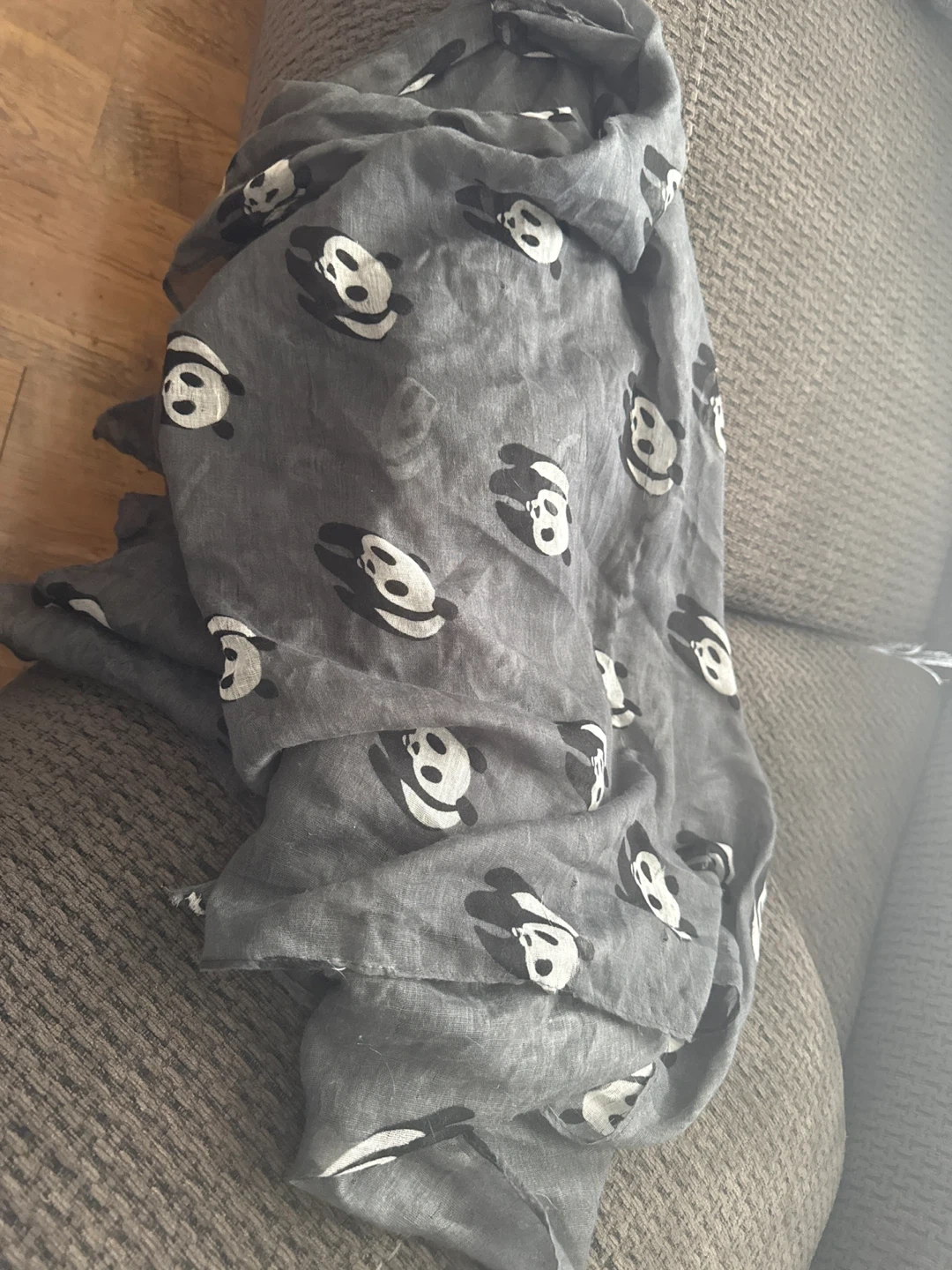 Cute grey scarf with a panda print pattern! It's lightweight and perfect for adding a touch of fun to any outfit. The material is soft and comfortable, making it great for all-day wear. It's in excellent condition and ready for a new home!