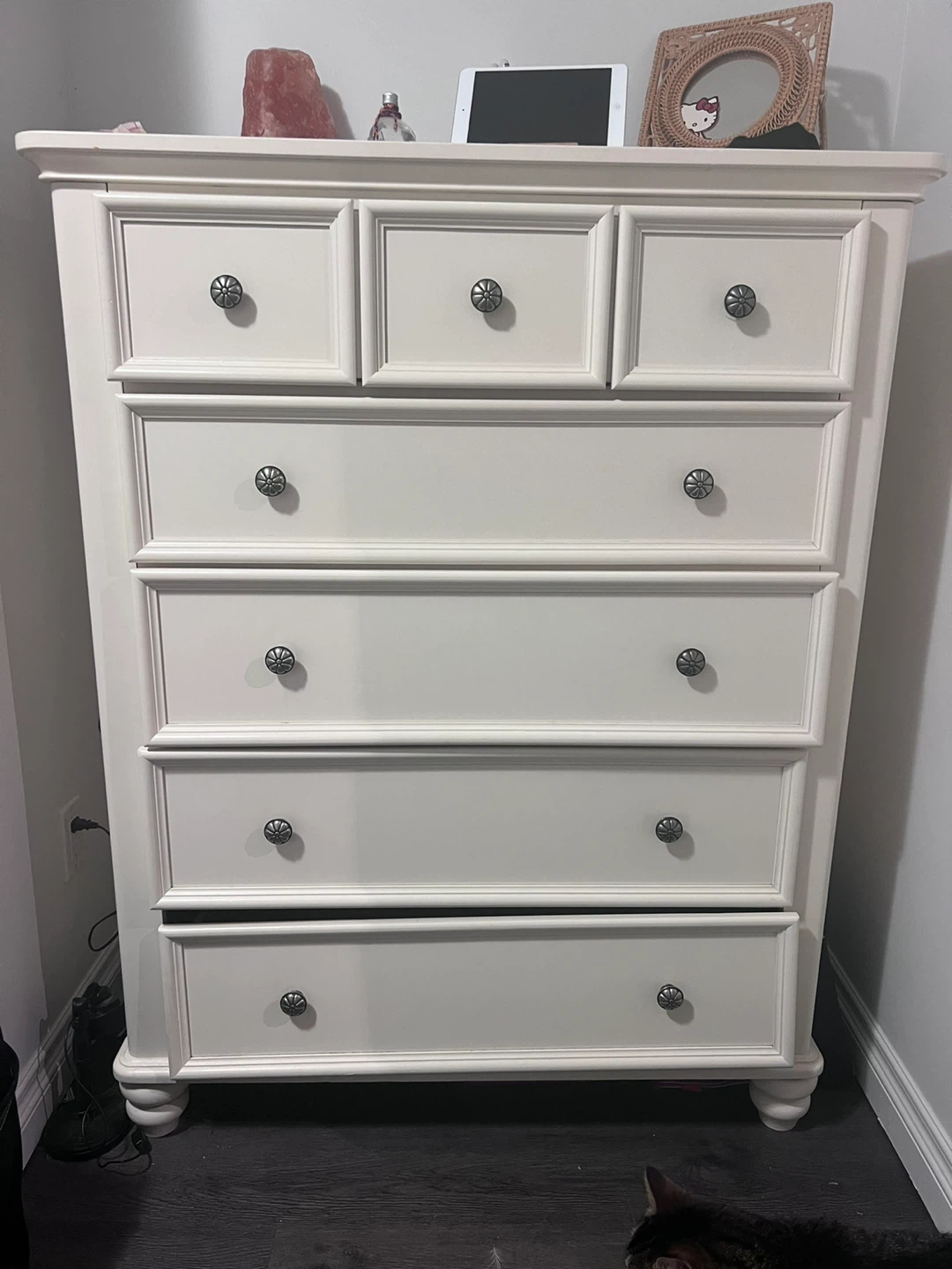 White wood dresser. Used/ok condition with the exception of the bottom drawer, it needs to be fixed with wood glue.