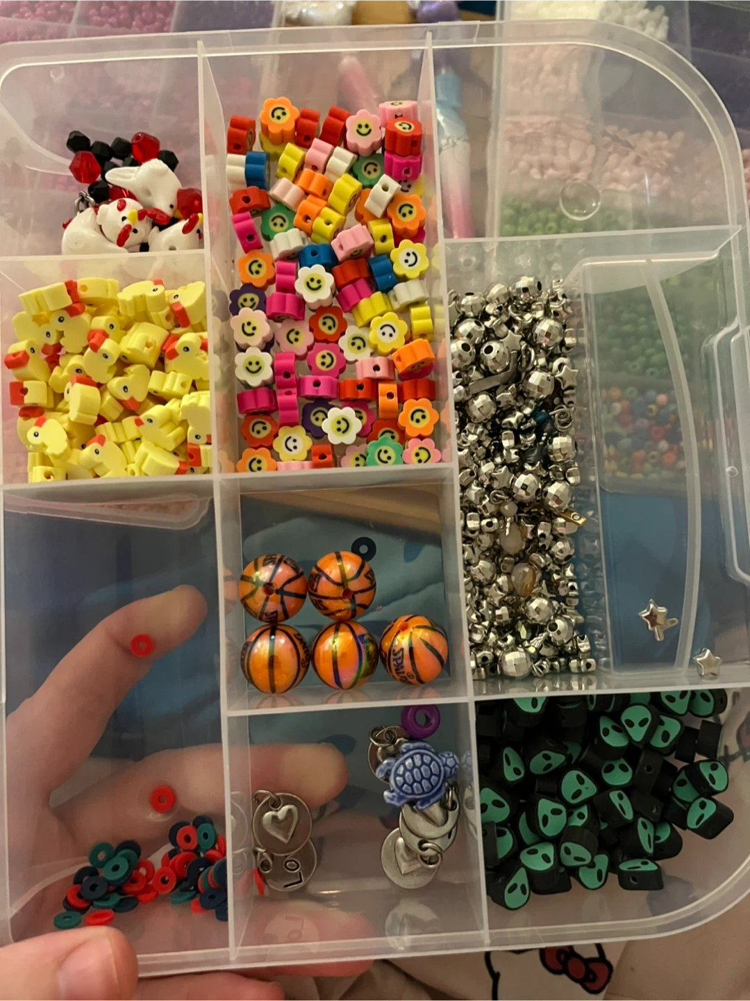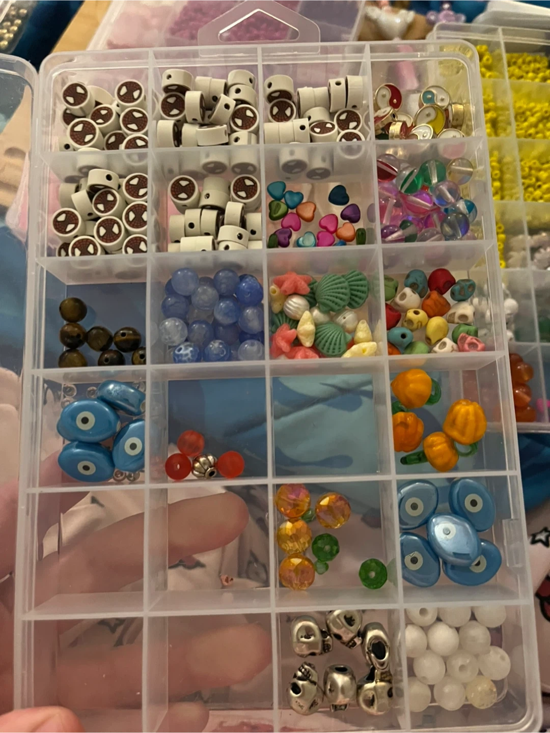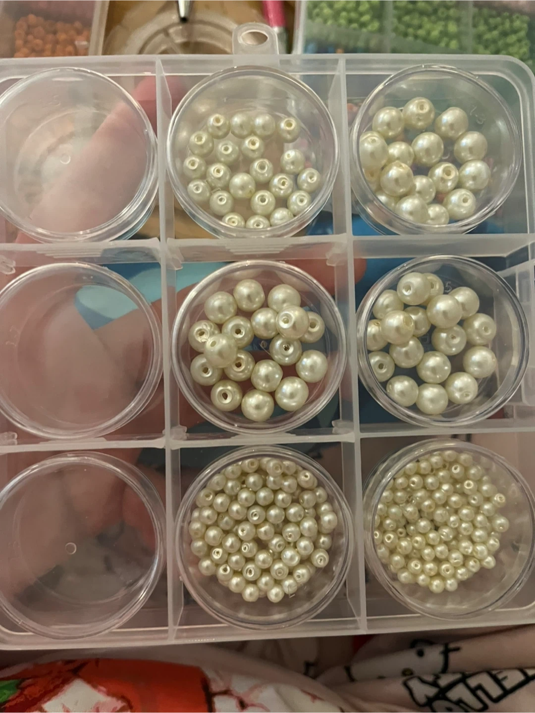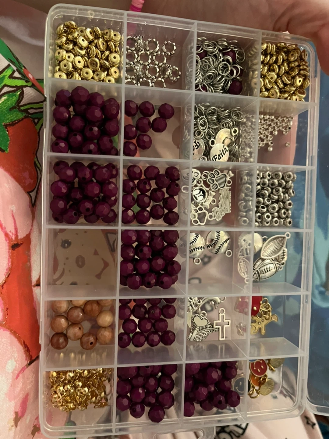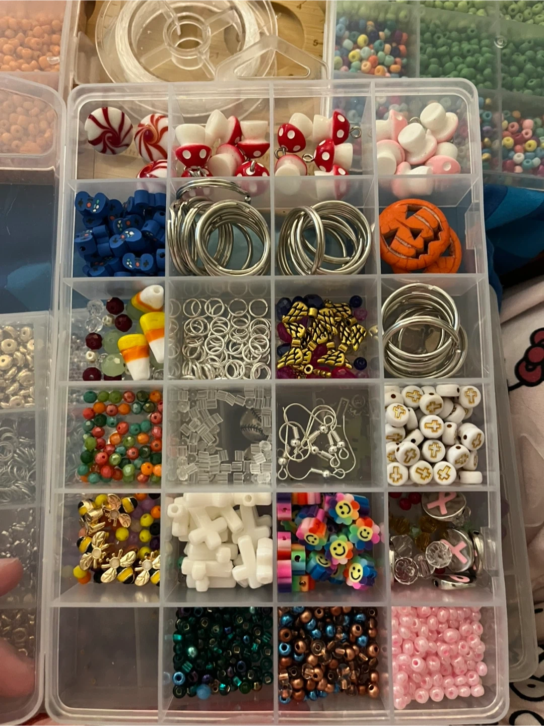 Huge assortment of craft beads, charms, and findings for jewelry making. Includes faux pearls, glass beads, metal charms, and more in various shapes and colours. Perfect for DIY projects!