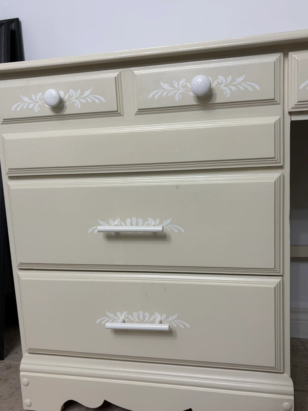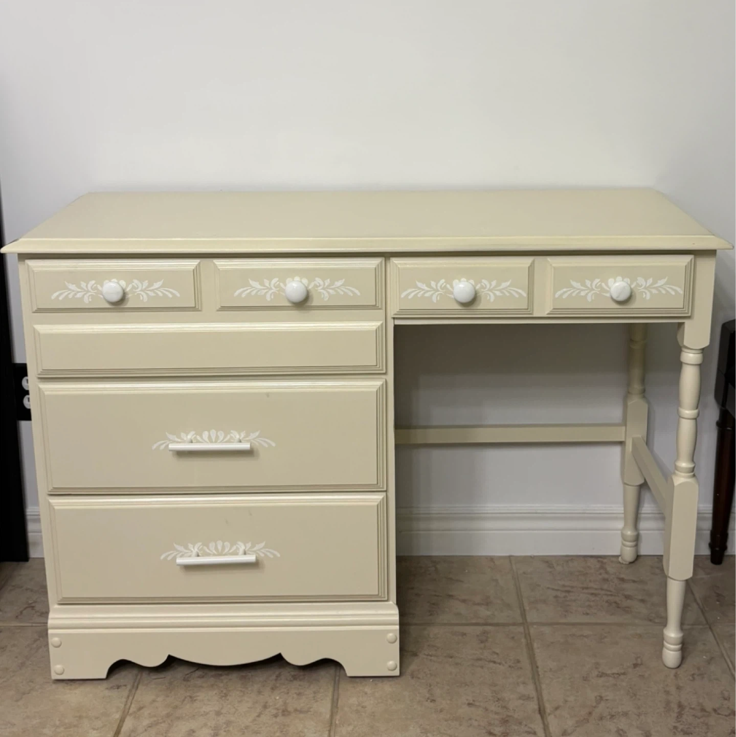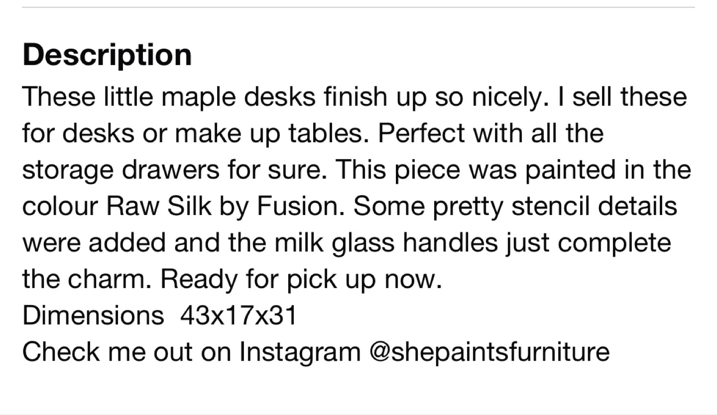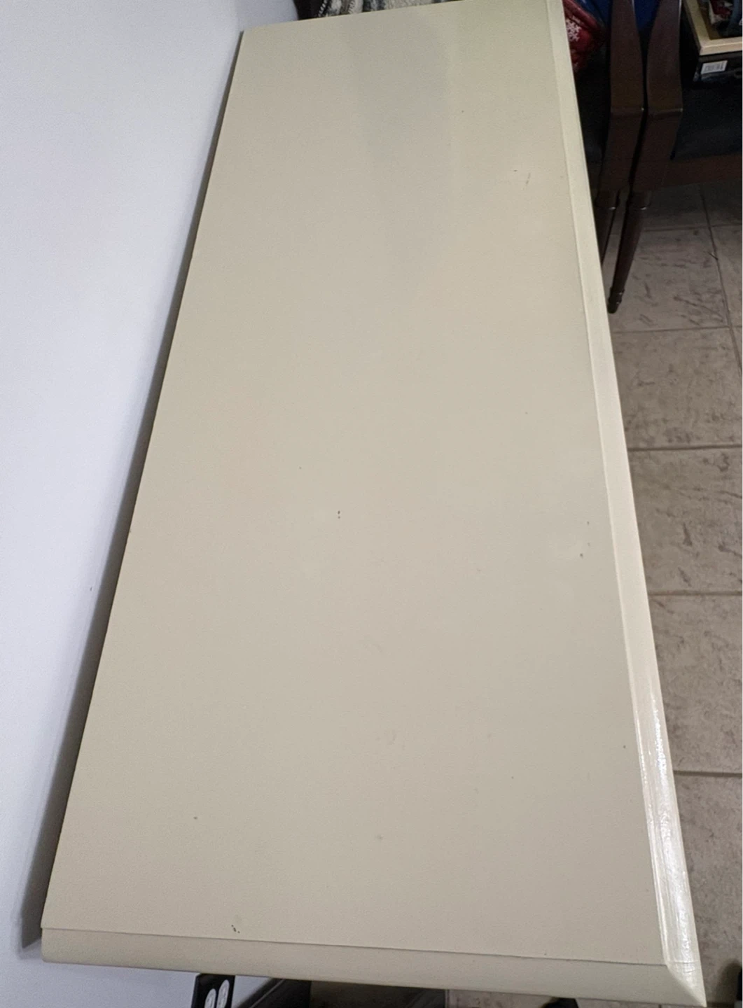 Selling because it won’t fit in my new house. Makes a great makeup or craft table. A few small marks shown in photos. Original description slide includes the exact paint color if you’d like to touch it up. Dimensions are 43x17x31 Made by @shepaintsfurniture in 2023