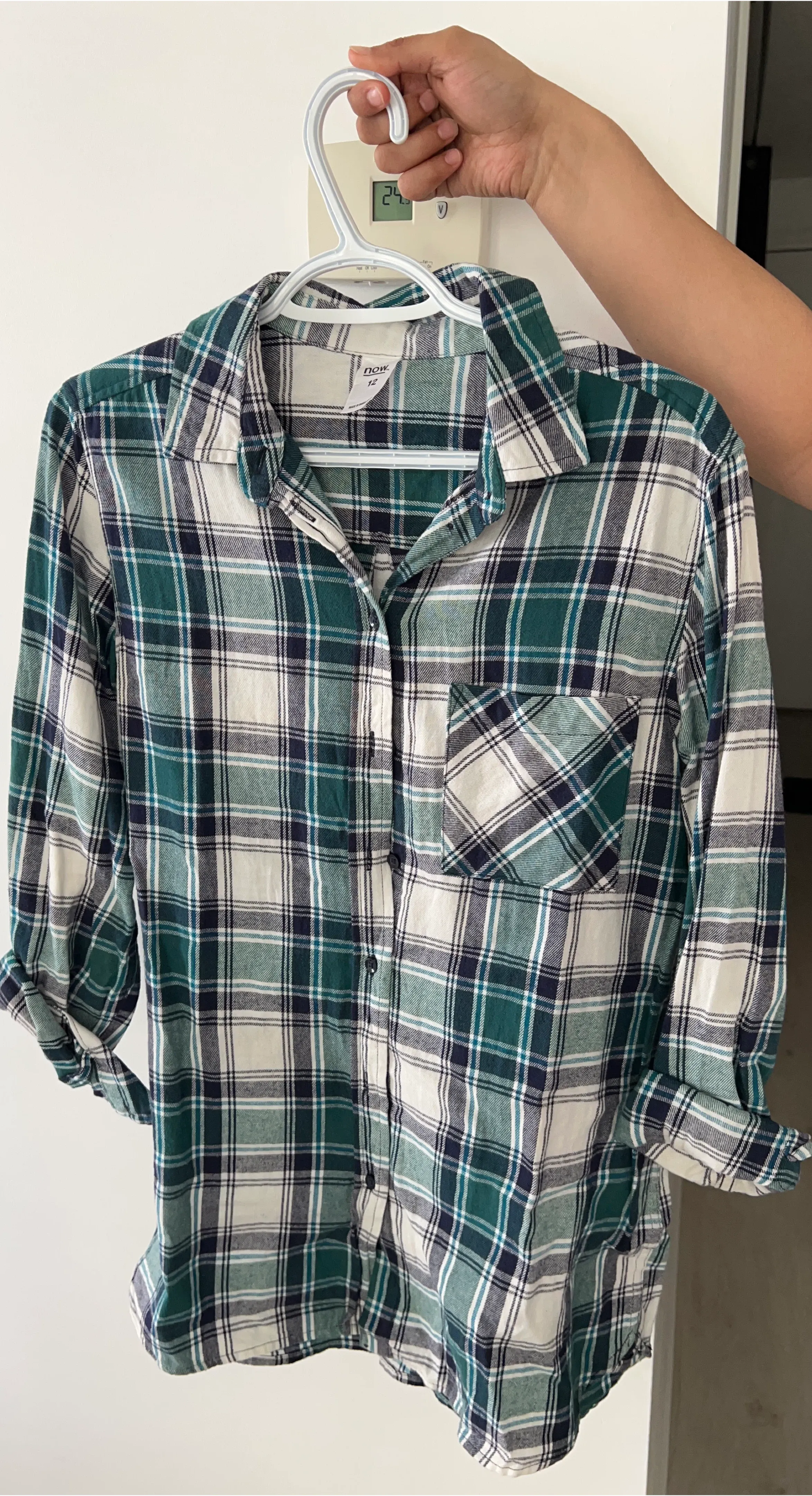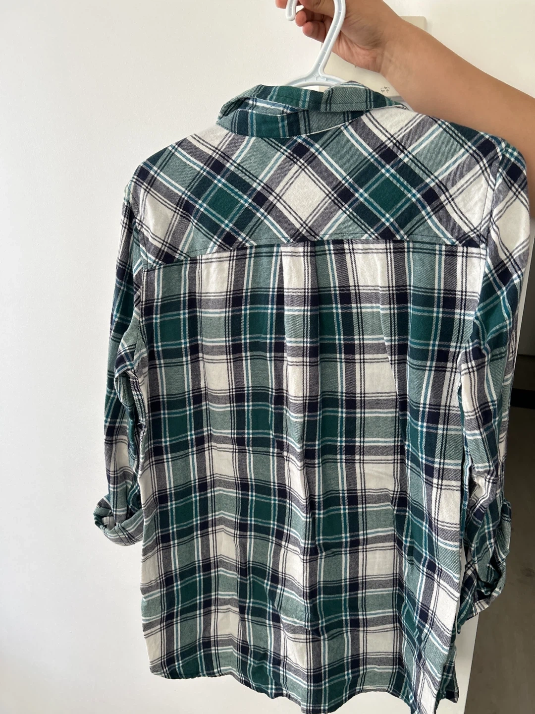 A cozy Forever 21 flannel shirt in a classic green plaid pattern! This shirt is perfect for layering or wearing on its own. It features a button-up front and a chest pocket. Great for a casual, comfortable look!