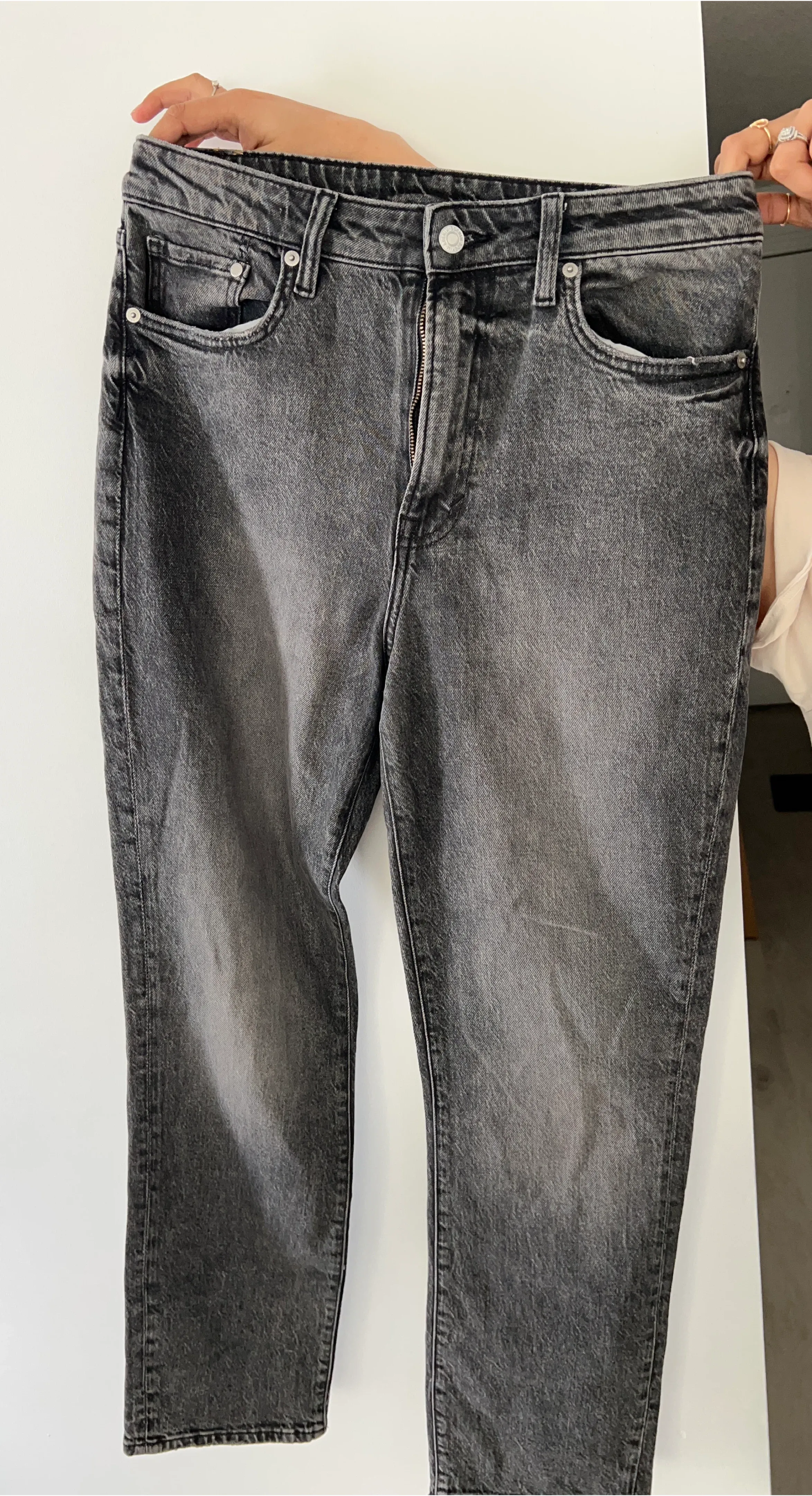 Selling a pair of grey denim jeans. They have a classic look and are in good condition. Perfect for everyday wear!