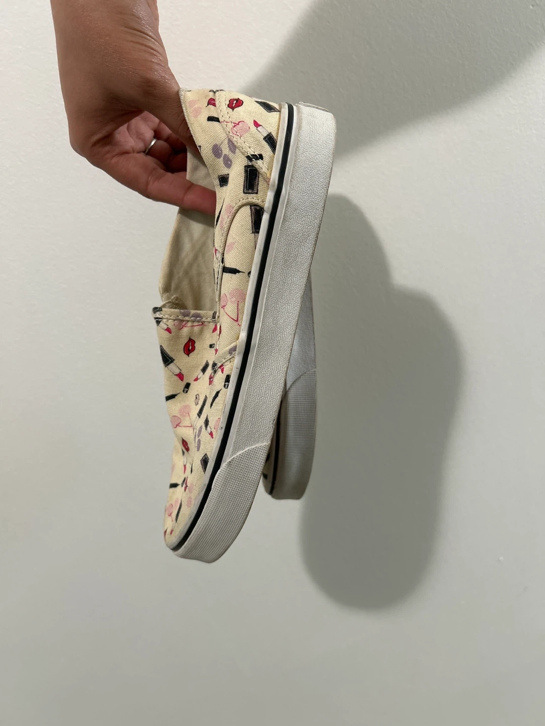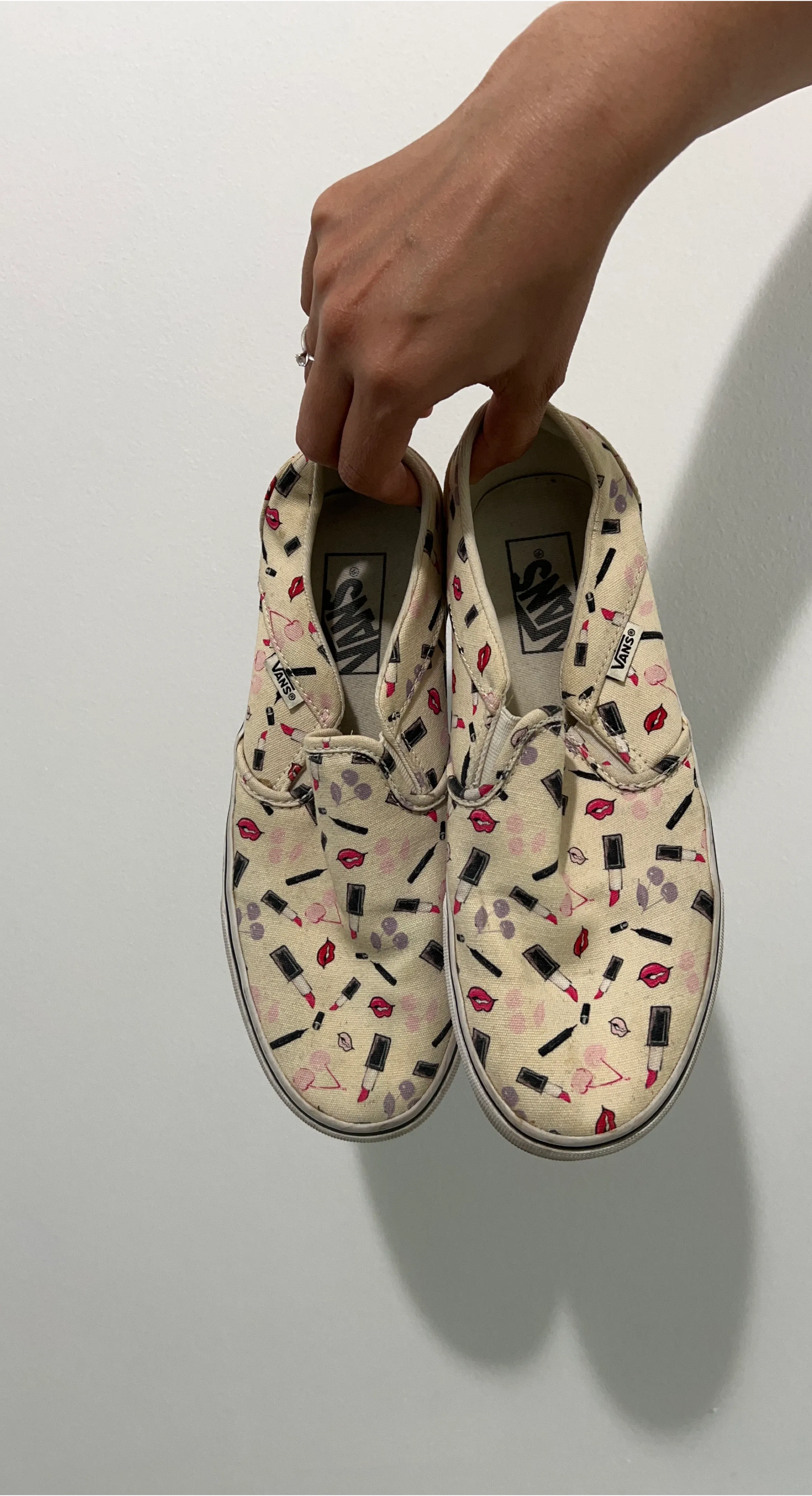 Selling a pair of Vans slip-on shoes with a fun cosmetic print! These are in good condition and ready for a new home. They feature a white sole and a unique design with lipstick and makeup motifs. Size is not indicated on the shoe.(US 8)