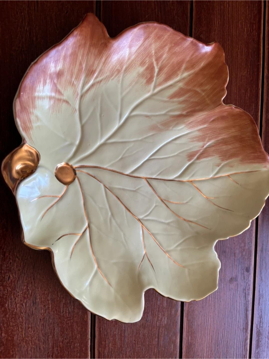 Selling a decorative leaf-shaped plate. It has a unique design with a leaf pattern and gold accents. It's in good condition and would make a lovely addition to any home decor. Very minor wear as per the last photo. 11” by 11”. Cash only.