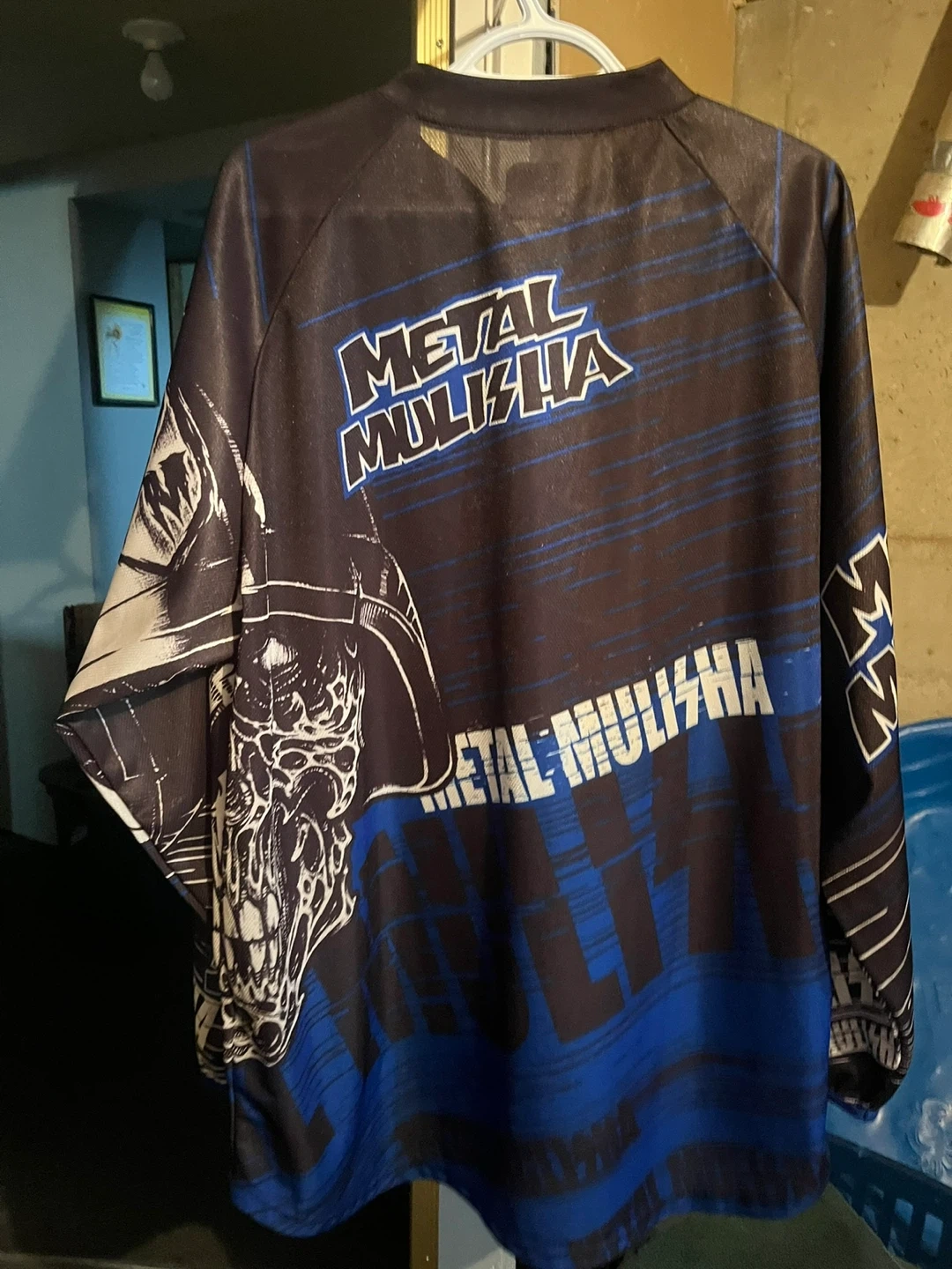 Selling a Metal Mulisha jersey in size 2XL. It's a long-sleeved jersey with a black and blue design. Check out the pictures for the details! Great for dirt bike or ATV riding.