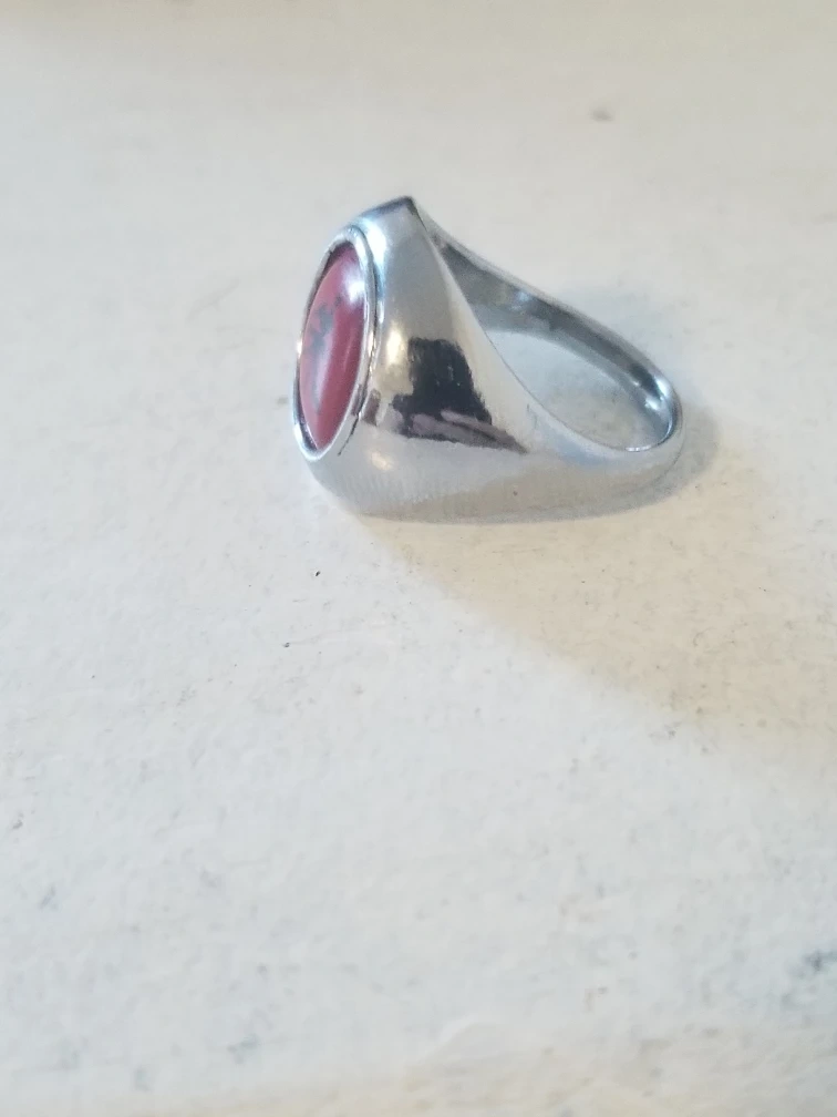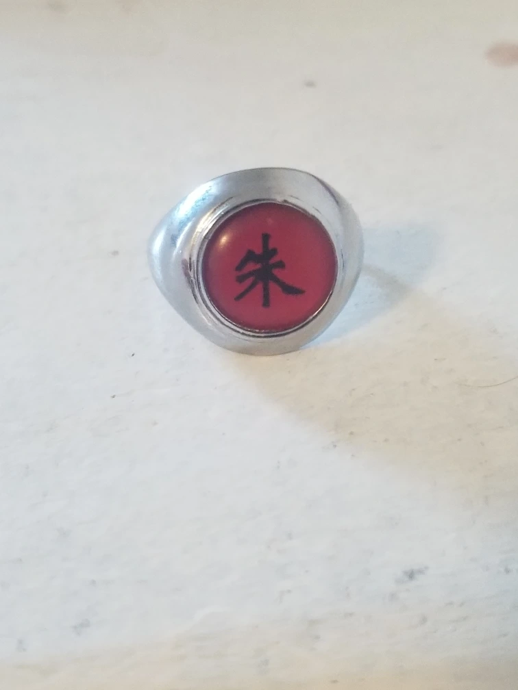 Selling an Akatsuki ring with a red background and the symbol '朱'. It's in great condition and ready for a new home!