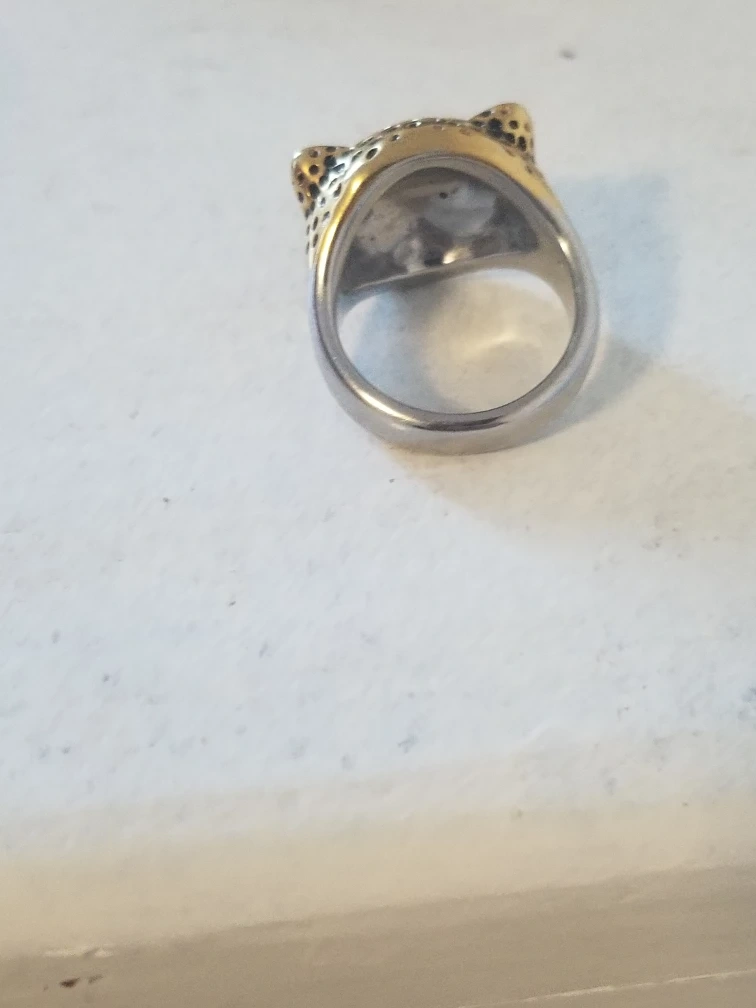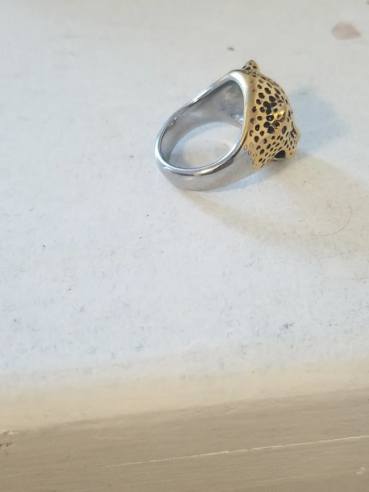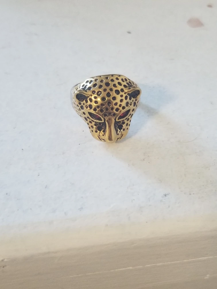 Selling a unique leopard head ring. It features a gold-tone finish on the leopard head and a silver-tone band. Perfect for adding a touch of boldness to your style