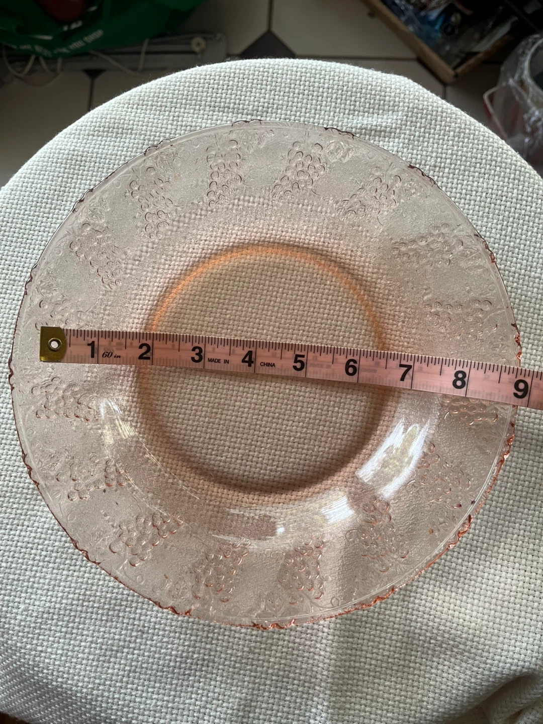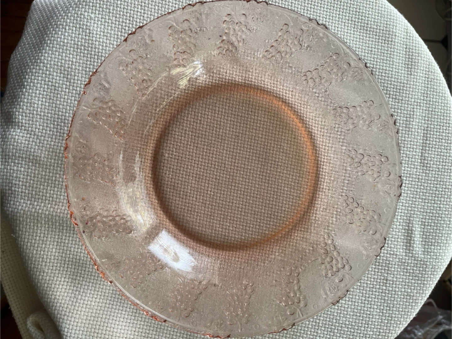 This is a lovely pink depression glass plate, with a harvest grape pattern on the rim. It's about 9 inches in diameter and would look great as a decorative piece or a plate for dainties.