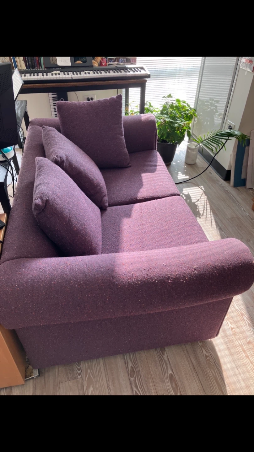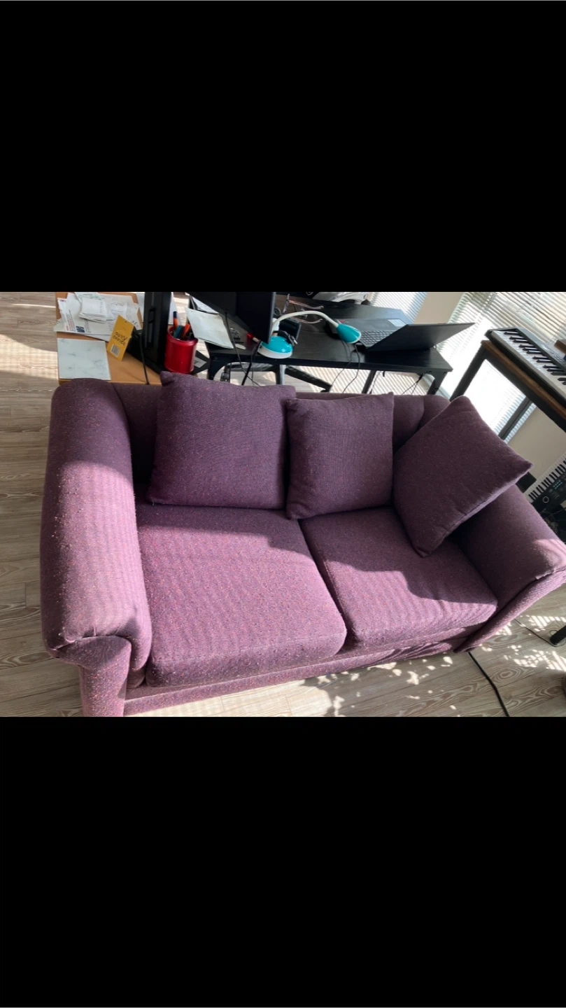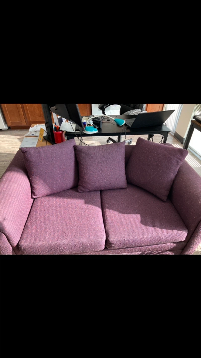 20I am giving away a two-seater couch (used to be called a love seat). Its value is $150 bucks. You wanna give me 150 bucks go for it. BUT—-IT’S FREE. It’s old, but it’s a clean, decent couch. It’s about ten years old. There is no cost. I just want to get rid of this couch so that I can get new furniture. I’m in a studio apartment and the couch doesn’t work for me anymore. Other than that, there is nothing wrong with it. It’s a faded maroon coloring and it’s big enough for two adults to sit on. To pick it up, you, the buyer, need to rent a small rental truck or a pick-up truck..