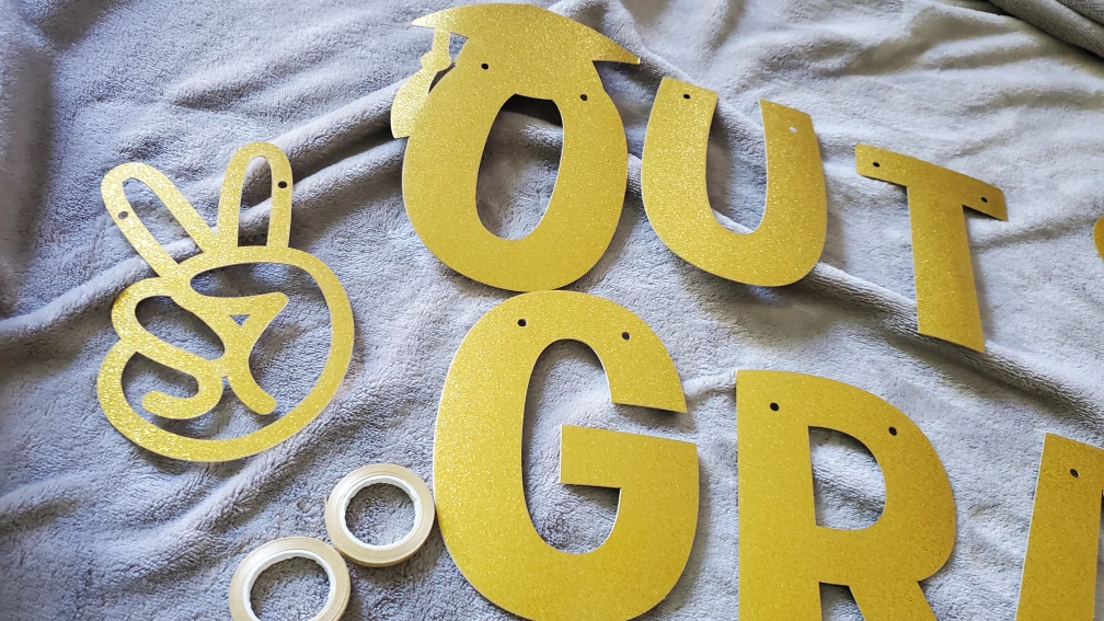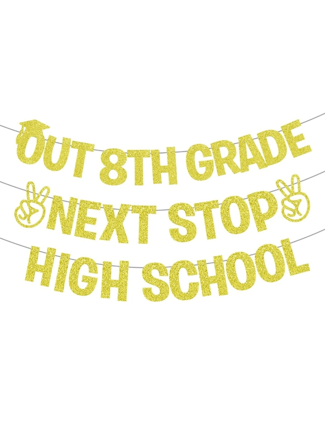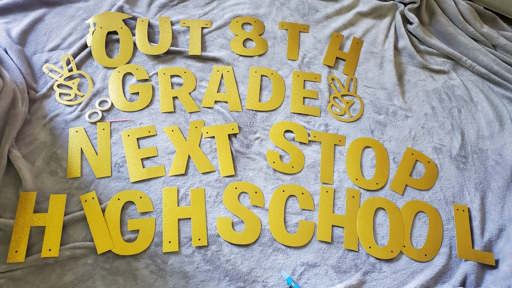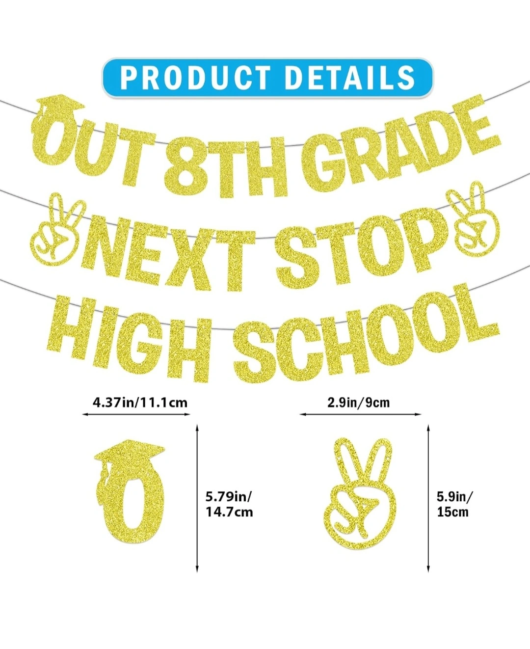 Get ready to celebrate your grad with this fun banner! It says "Out 8th Grade Next Stop High School" and has a peace sign and grad cap. Each letter is about 4.37 inches/11.1 cm wide and 5.79 inches/14.7 cm tall