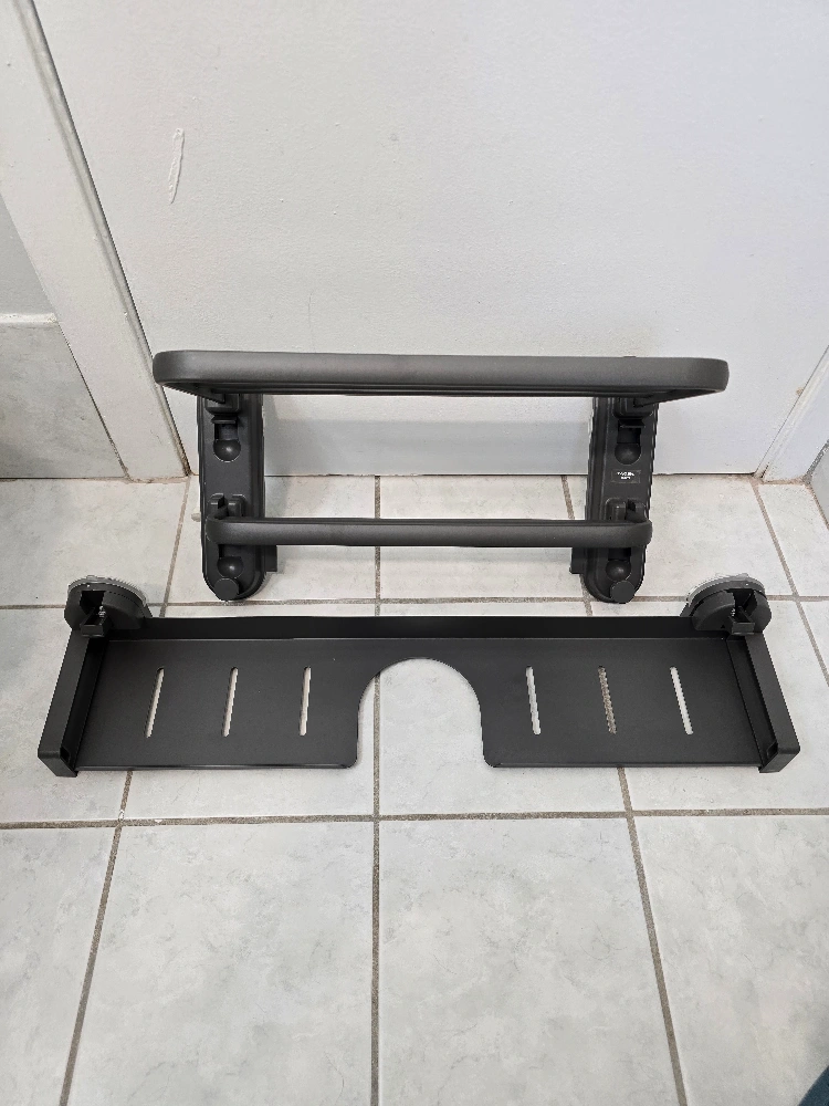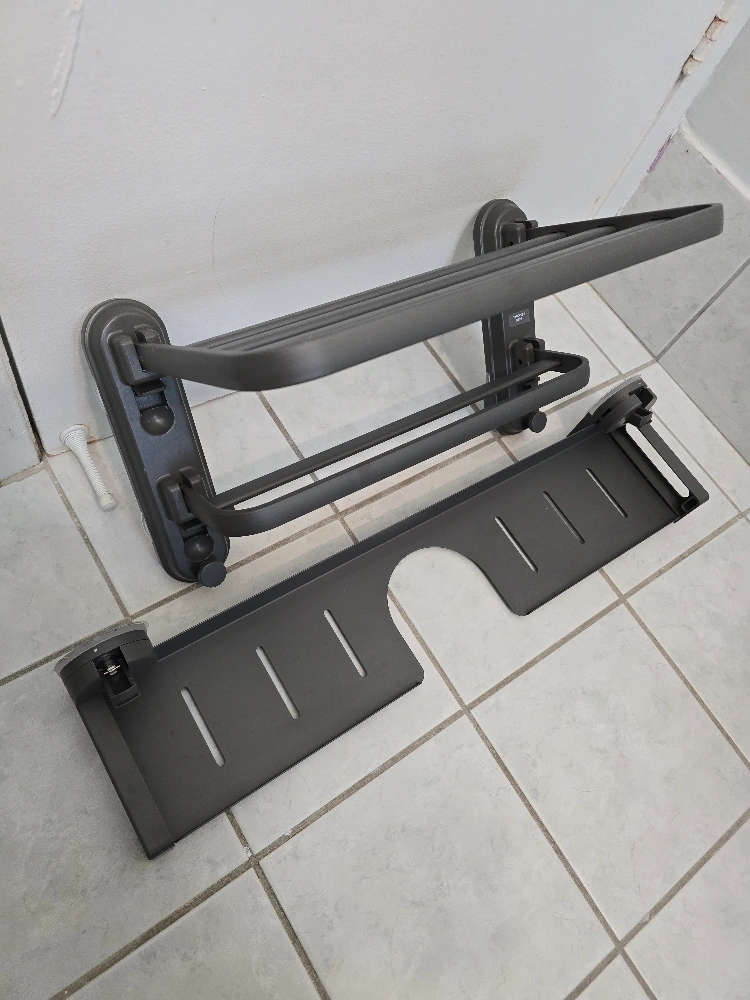 Selling a grey bathroom shelf with a built-in towel rack. It's in great shape and ready to add some organization to your bathroom space. Perfect for storing toiletries and hanging towels.