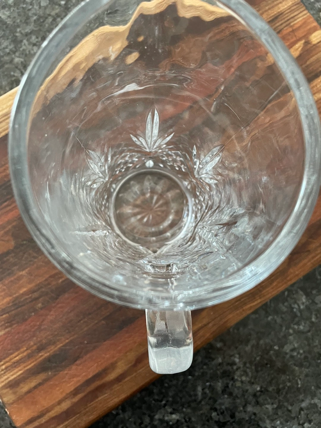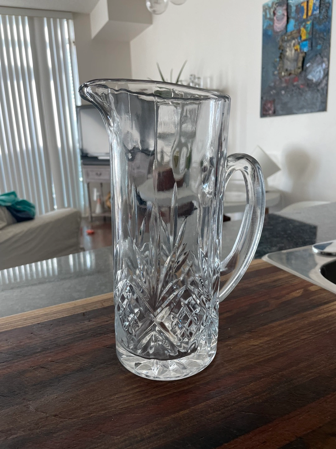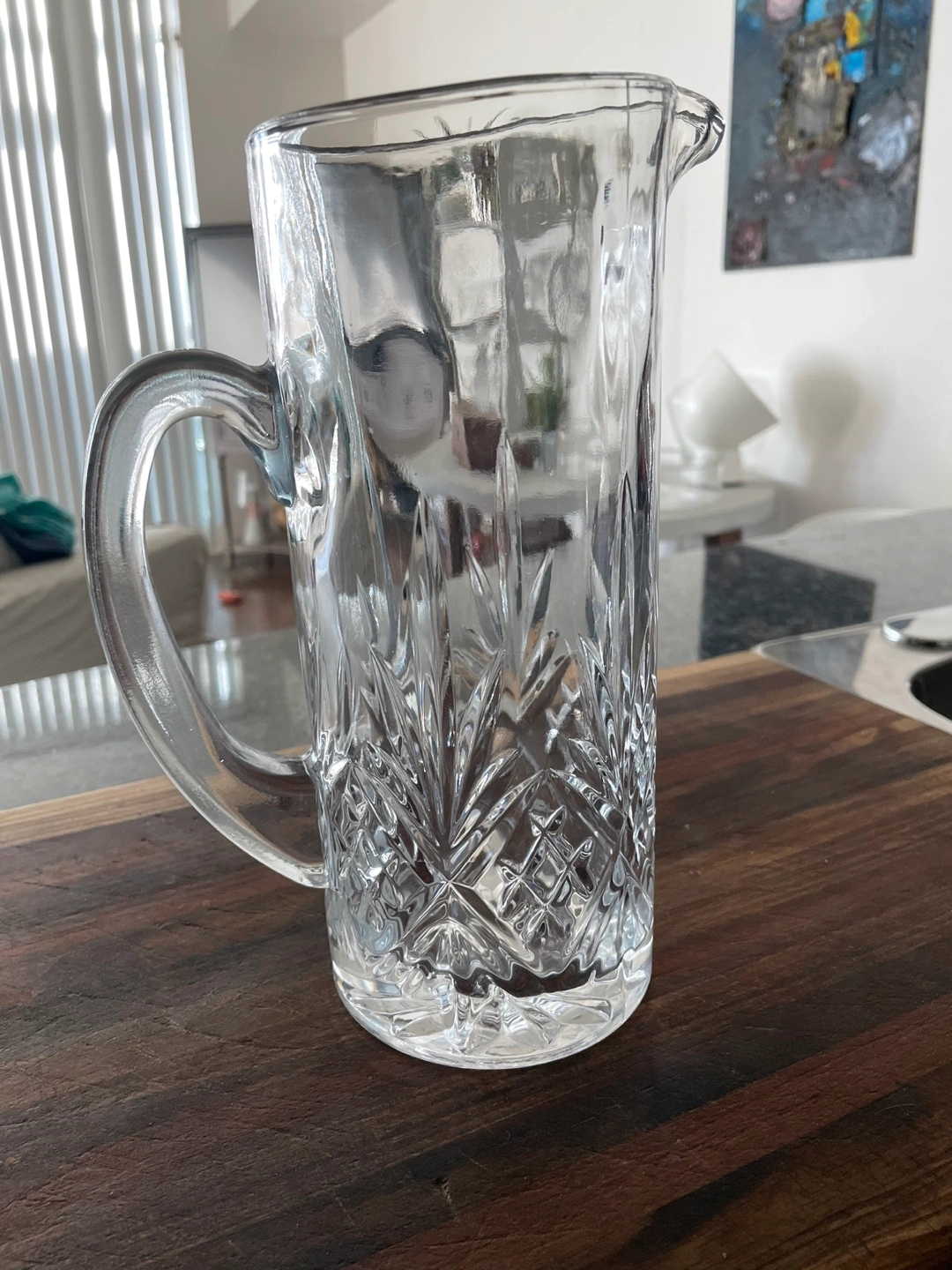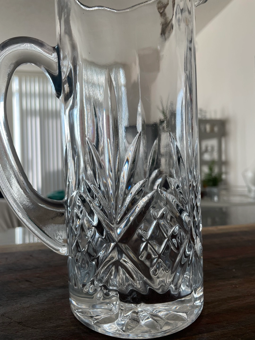 Crystal glass decanter. No chips or cracks. Holds over a litre . Was used for a short time as a vase for flowers. Pick up only.
