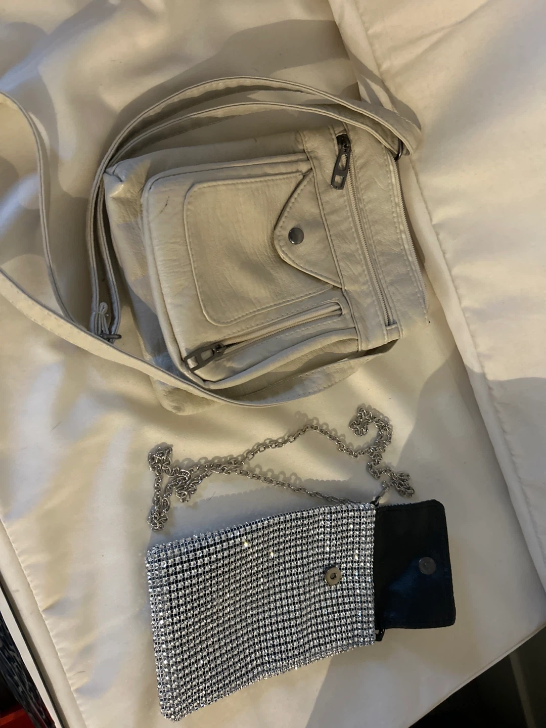 237Selling two purses together! One is a beige crossbody bag with multiple pockets and zippers. The other is a silver clutch with a chain strap, perfect for a night out