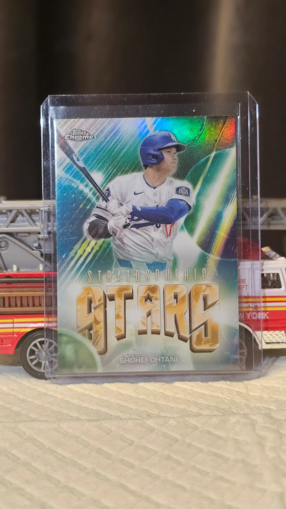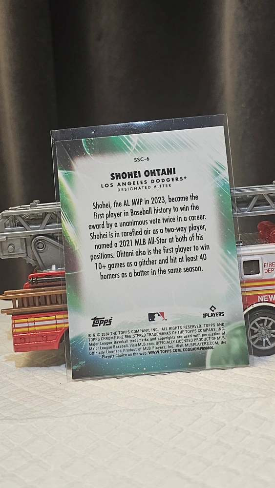 Selling a Shohei Ohtani baseball card. It's a Topps Chrome card featuring Shohei Ohtani of the Los Angeles Dodgers. The card highlights Ohtani's achievements as the AL MVP in 2023 and his unique two-way player status