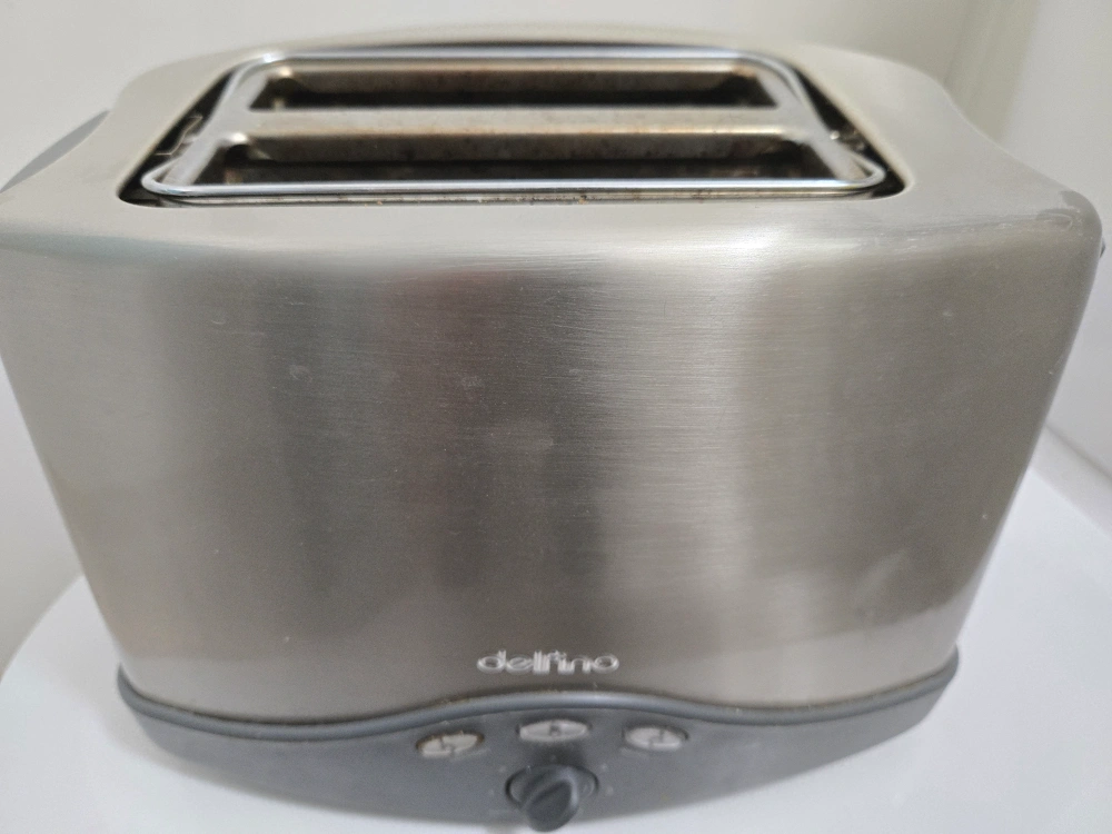 Selling a Delfino toaster, model DLT-362. It has settings for defrost, bagel, reheat, and cancel. The toaster has a dial to choose the darkness of the toast. It's in used condition, but still works good.