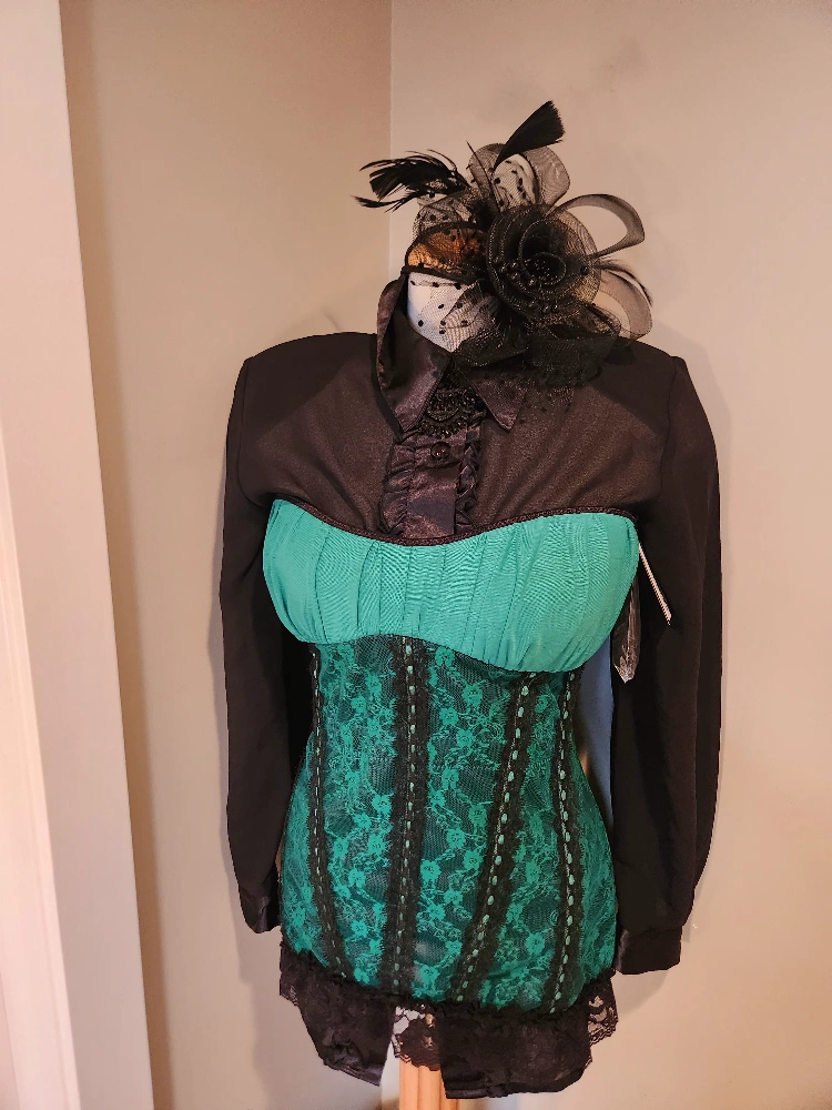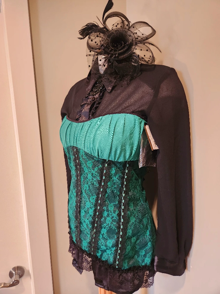 This jazzy NEW WITH TAGS SIZE 1X/2X corset makes a great holloween outfit. This unique Kelly green and black corset is great over a frilly lace or sheer blouse