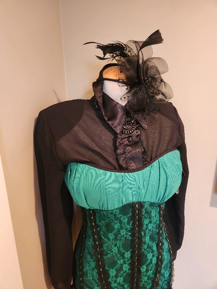 Features a lace bodice with a black trim comes with detachable strapsfor support. It looks teal color in photos. but its actually kelly green and black. A great Gothic inspired look under a velvet blazer. I'm selling those as well! Perfect for a Holloween event. Vampire costume or special occasion! What a lovely vintage-inspired look! A versitile statement piece for All Hollows Eve or any event that requires a sultry Gothic flare. Also suitable for pirates, New Romantic, Goths or Faeries! Vintage Med/ large. FOLLOW FOR other ads, AND MORE VINTAGE VELVET AND Stay tuned for more gothic and dark cottage core clothing finds!