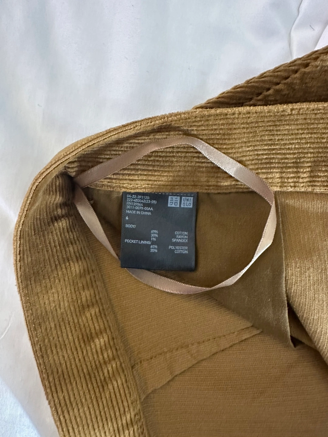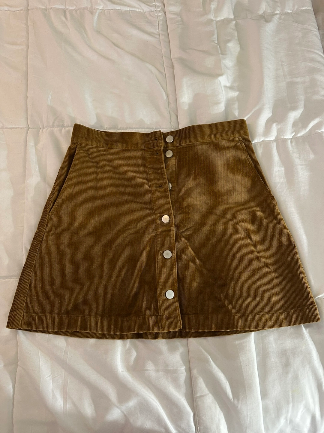 Selling a cute Uniqlo corduroy mini skirt in size small. It's a nice brown colour and made of 69% cotton, 30% polyester, and 1% spandex. The pocket lining is 65% polyester and 35% cotton. It's in great condition and ready for a new home!