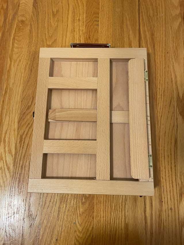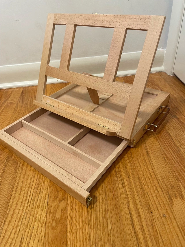 This portable desktop art easel is perfect for painting and drawing anywhere you go! The easel is in great condition, with a convenient drawer for storing brushes, paints, and other supplies. It's ideal for artists of all levels, providing a sturdy and adjustable surface for creative work. You can store supplies and sketch/paint all at the same time. * Adjustable angles * Light brown colour, made of wood * Storage drawer * Lightweight and portable