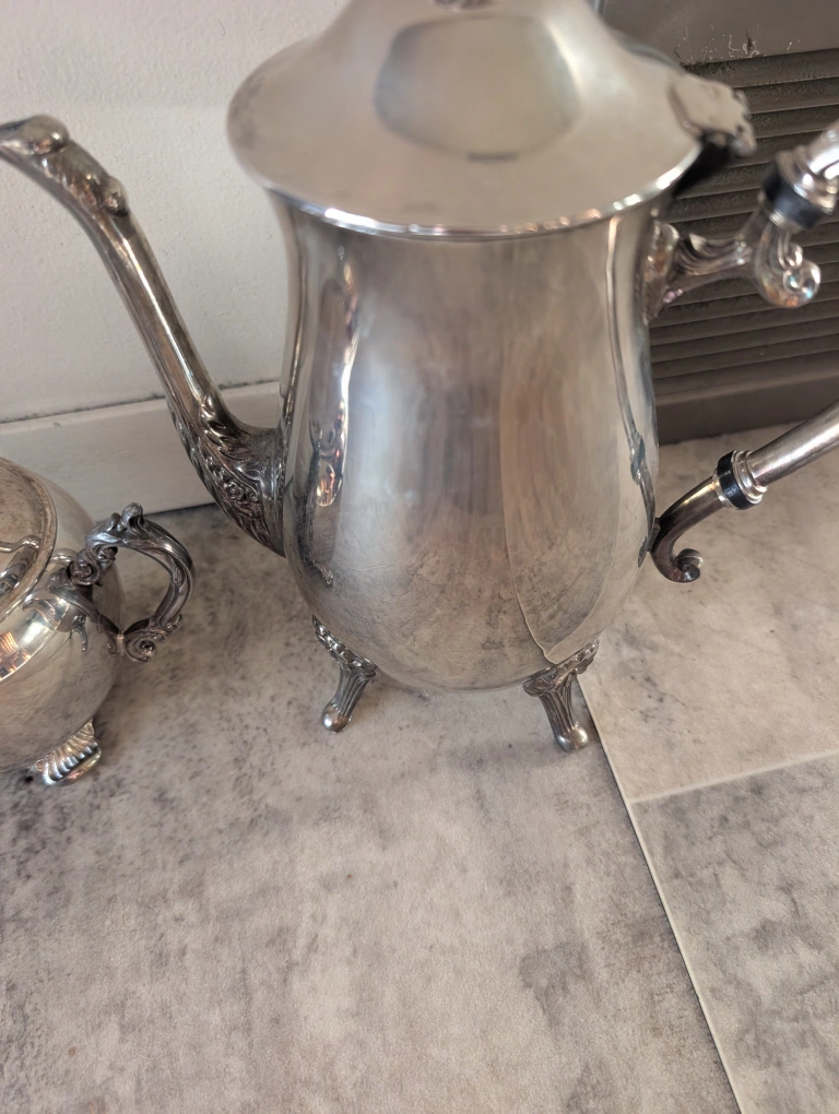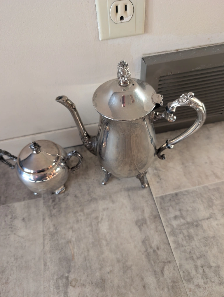 Selling a beautiful silver plated tea set by F.B. Rogers! It includes a teapot and sugar bowl. The set is marked on the bottom with "F.B. Rogers E.P. Brass Lead Mtrs. U.S.A." 110$ or best offer