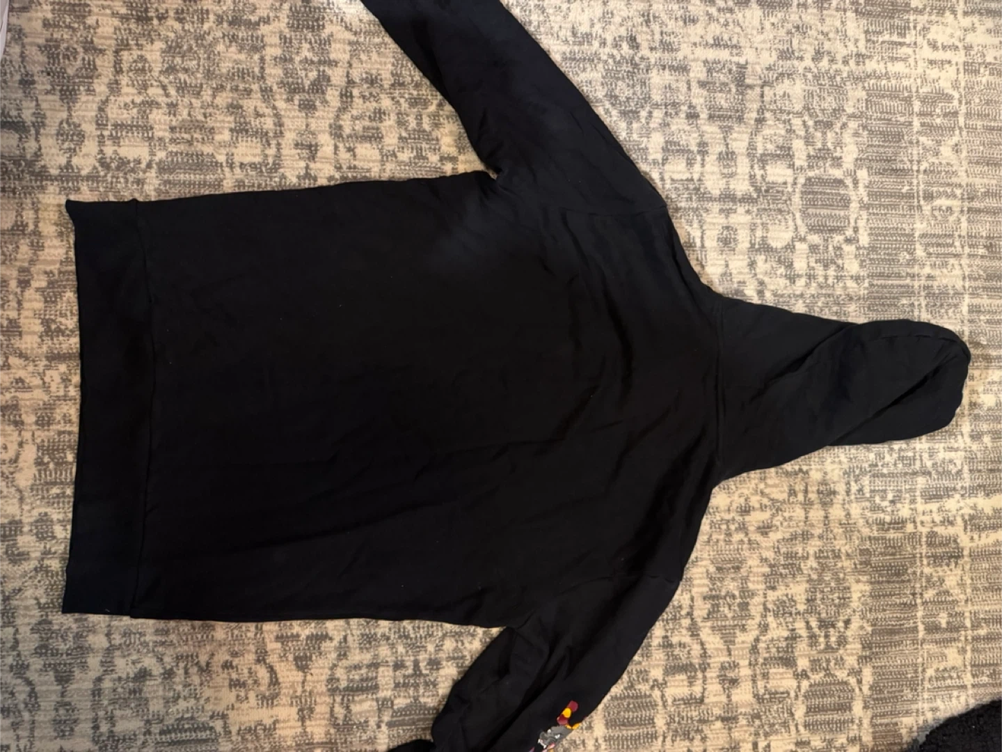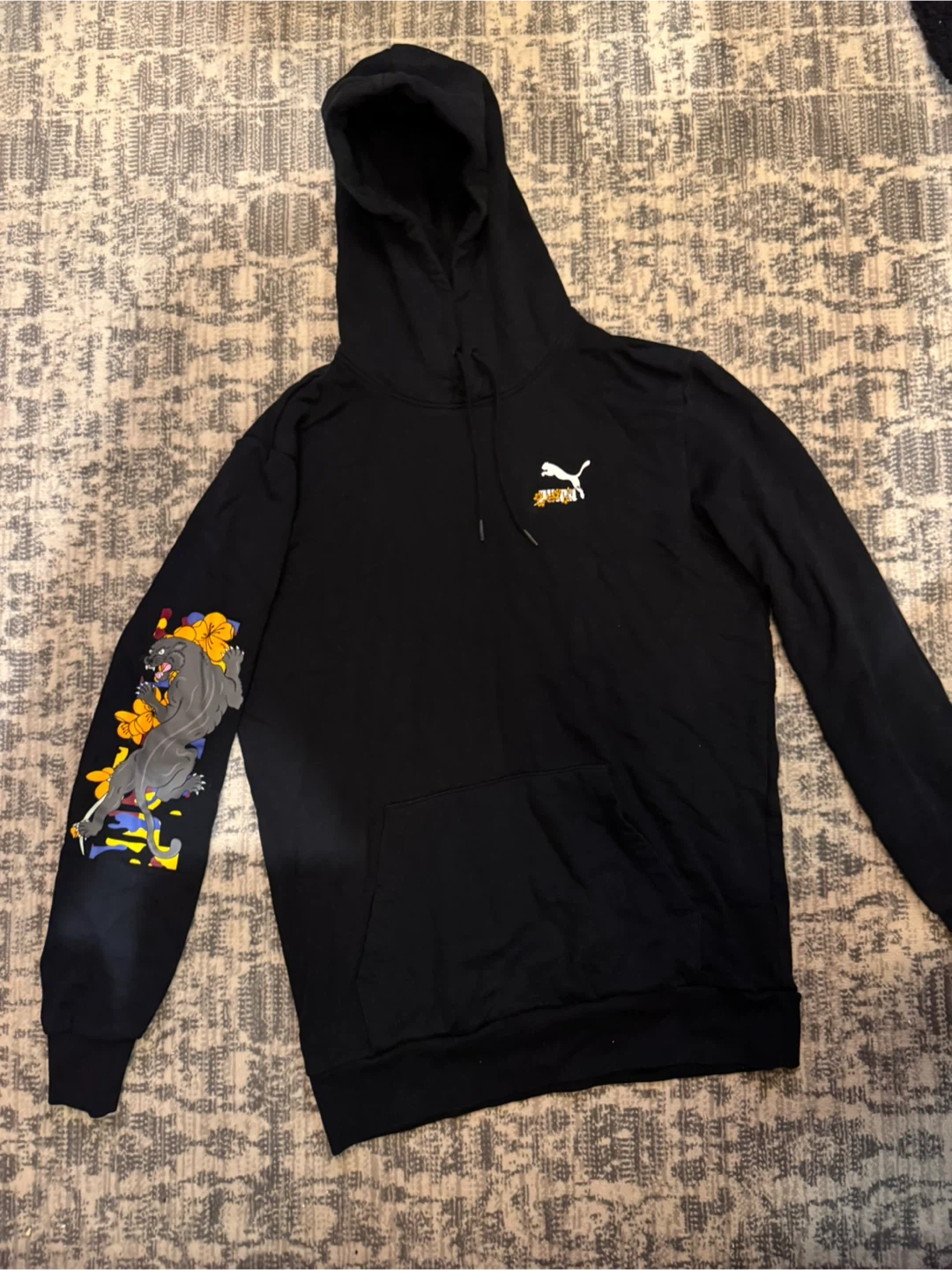 Selling a black Puma hoodie. It has a cool design on the sleeve and the Puma logo on the chest. It's in great condition and perfect for staying cozy