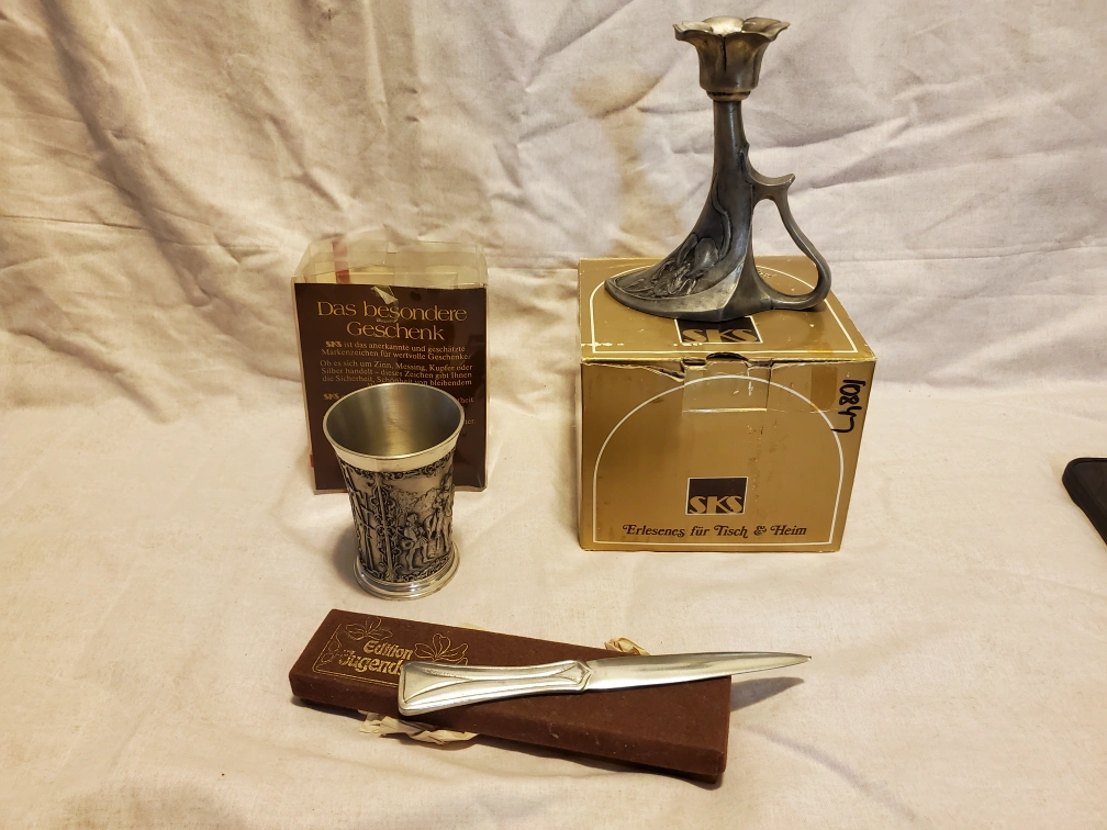 Selling a lovely set of SKS Zinn pewter items. Includes a candlestick holder, a decorative cup, and a letter opener. All in good condition and come with their original boxes!