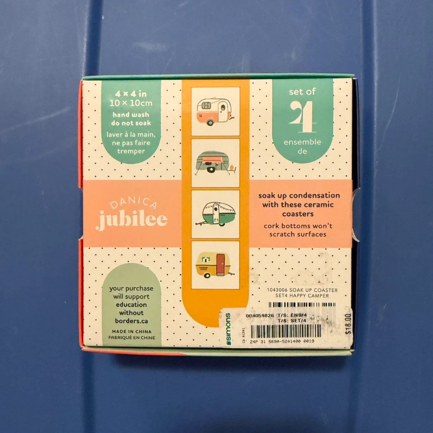Keep your surfaces safe with this set of four Danica Jubilee coasters! They feature a cute camper design and are made of ceramic with cork bottoms to prevent scratching. Each coaster is 4 x 4 inches (10 x 10 cm). Originally bought for $16. Hand wash only, do not soak. PLEASE NOTE: Pickup in Tuscany area or meetup up at Market Mall. Price is firm. Cash only. Please send me a message with date/time to pickup.